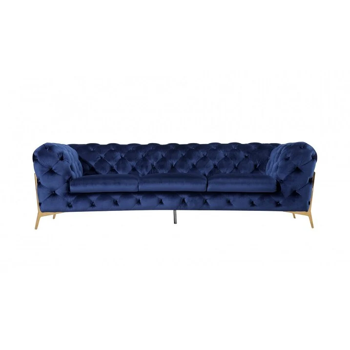 Contemporary 97 Blue Velvet And Gold Accent Sofa