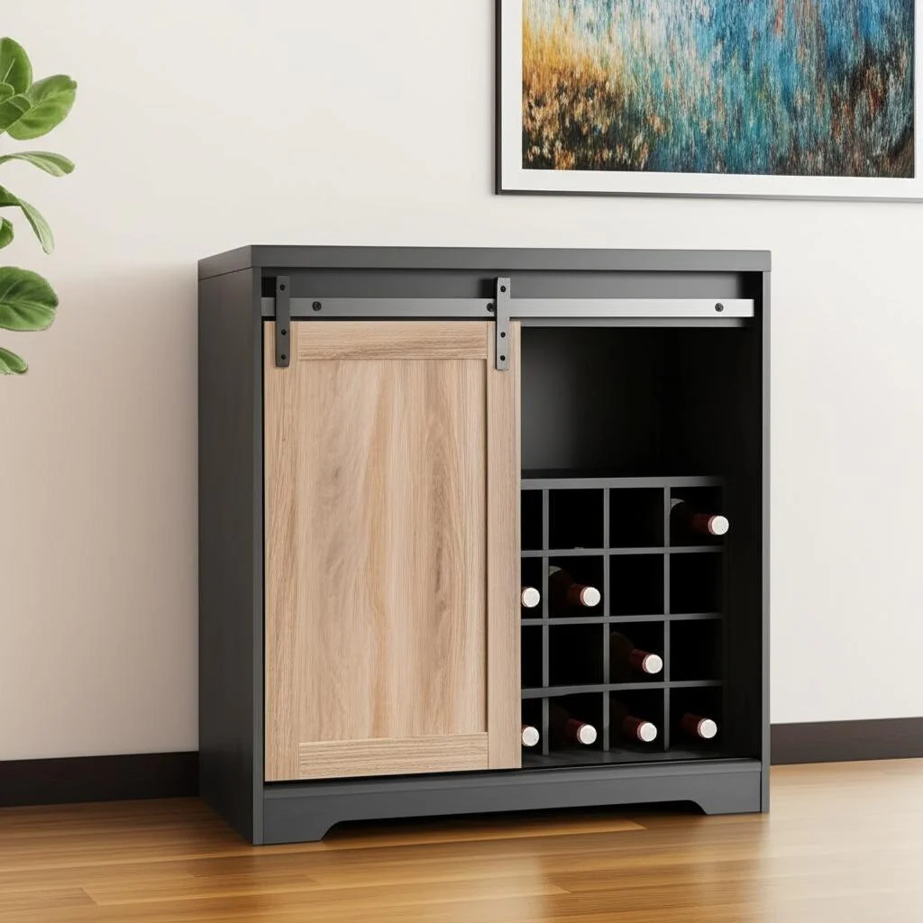 HomeRoots 32 Charcoal And Natural Wood Barn Door Bar Cabinet
