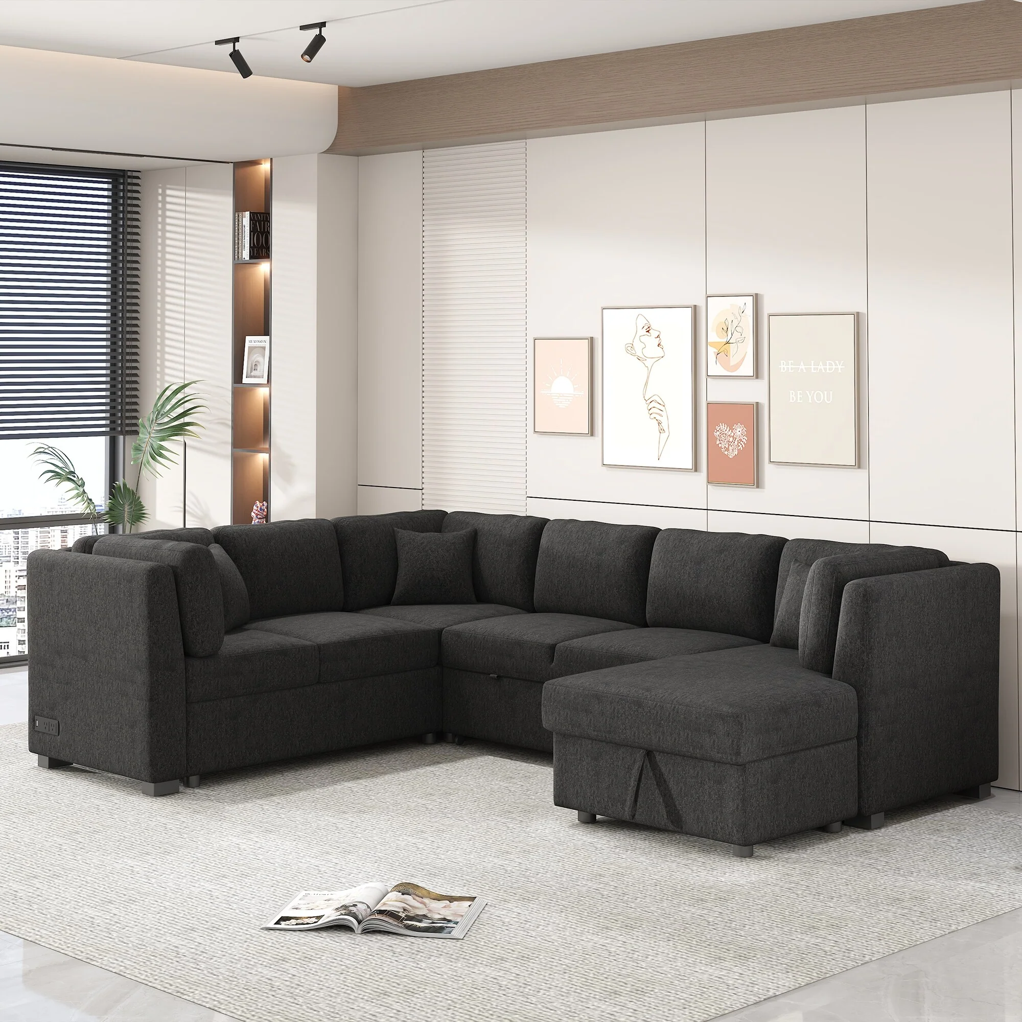 95.3 Corduroy Sectional Sofa with Storage, Cup Holders & USB