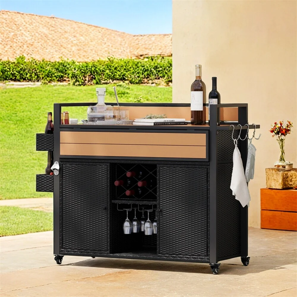 52.8W Wicker Outdoor Grill Cart with Extended Plastic Wood Table Top