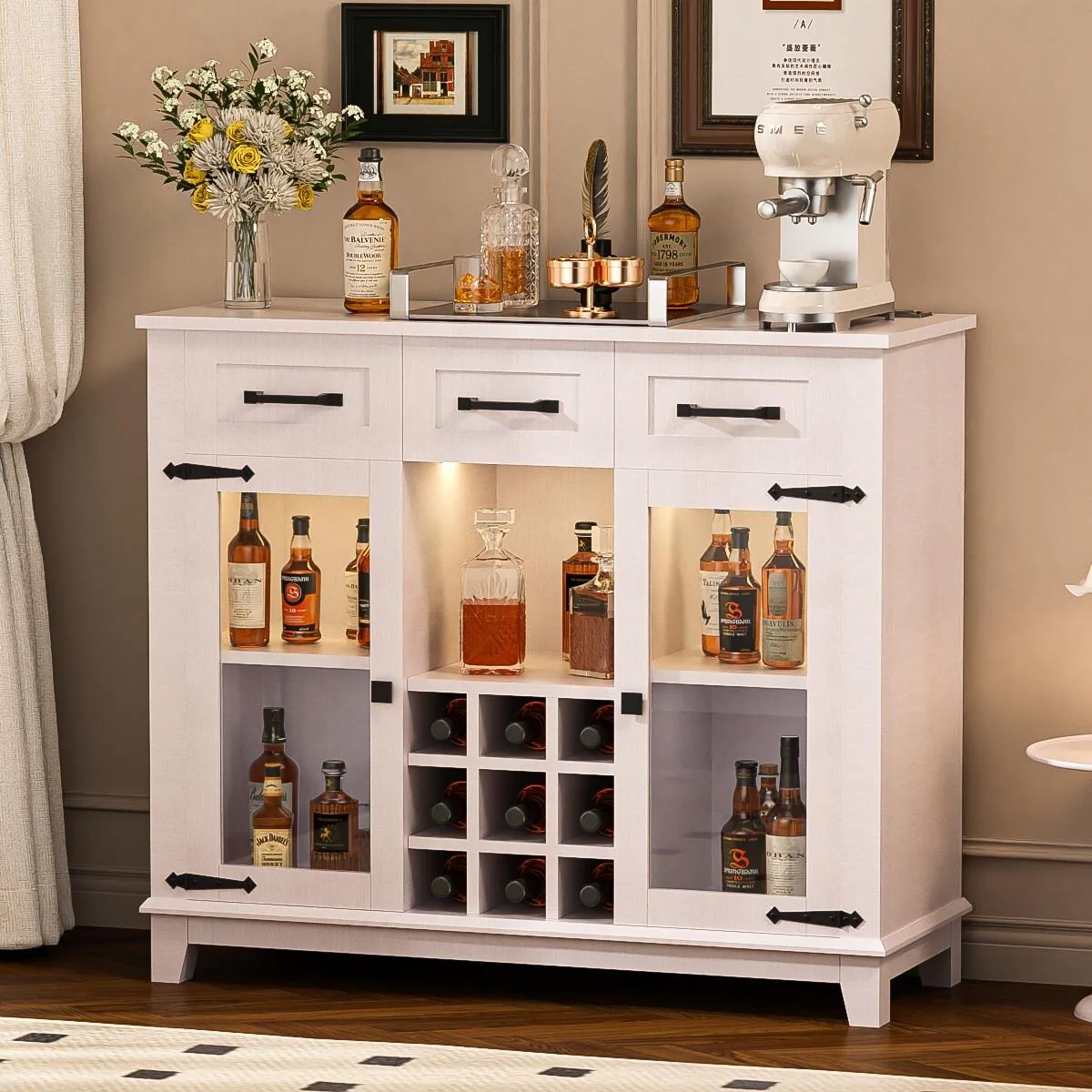 47 Farmhouse Bar Cabinet with Storage and LED - N/A