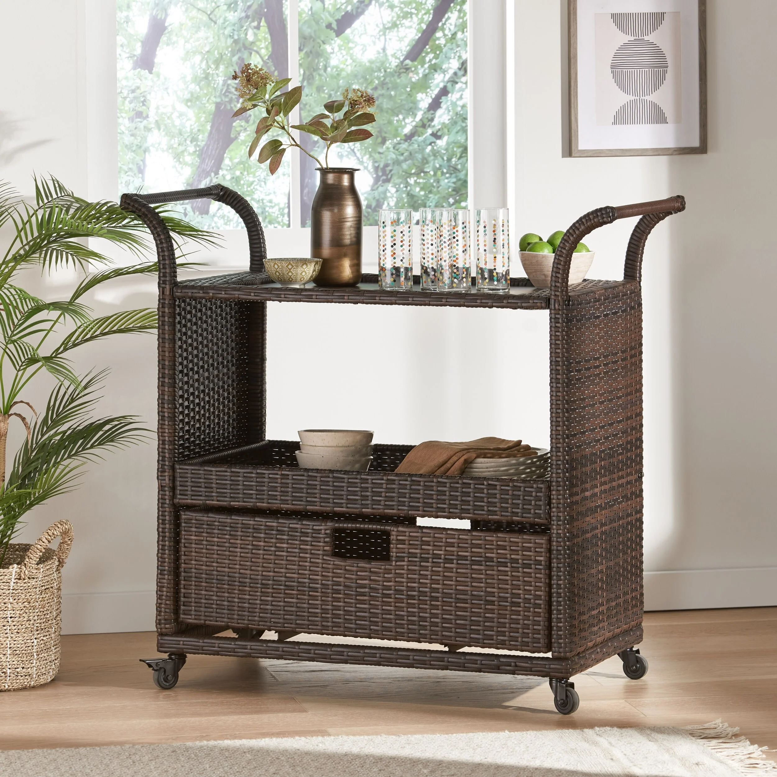 Jerrick Walnut & Black Finish Serving Cart(no include stool)