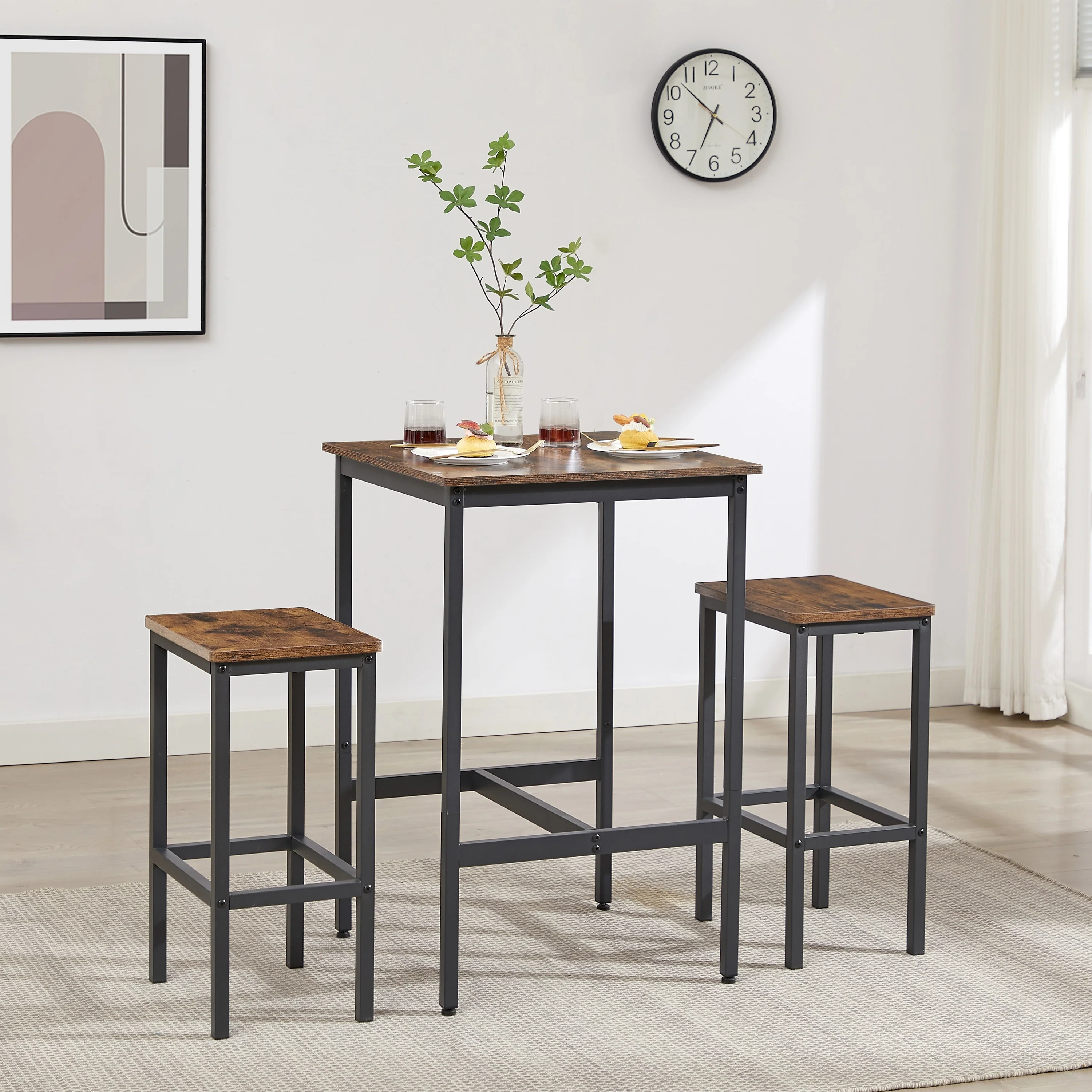 Square Bar Table with 2 Bar Chairs, Industrial Style Bar