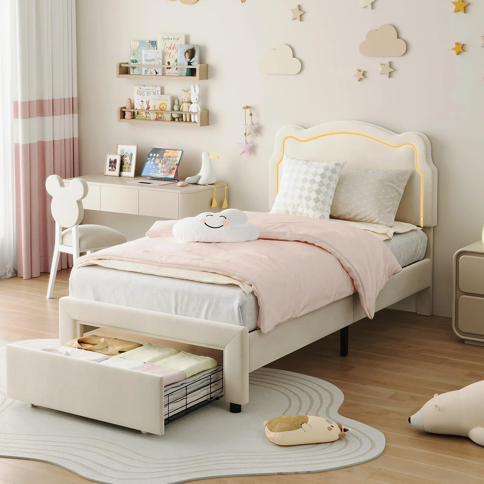 Gymax Twin Size Wooden Bed Frame w/ Charging Station & LED Light