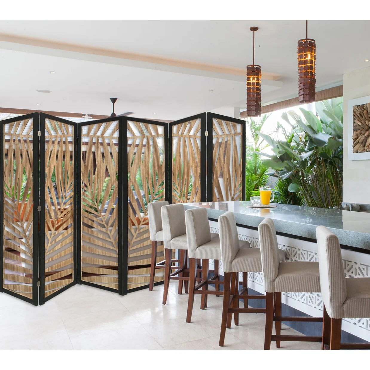 3 Panel Room Divider with Tropical Leaf Design