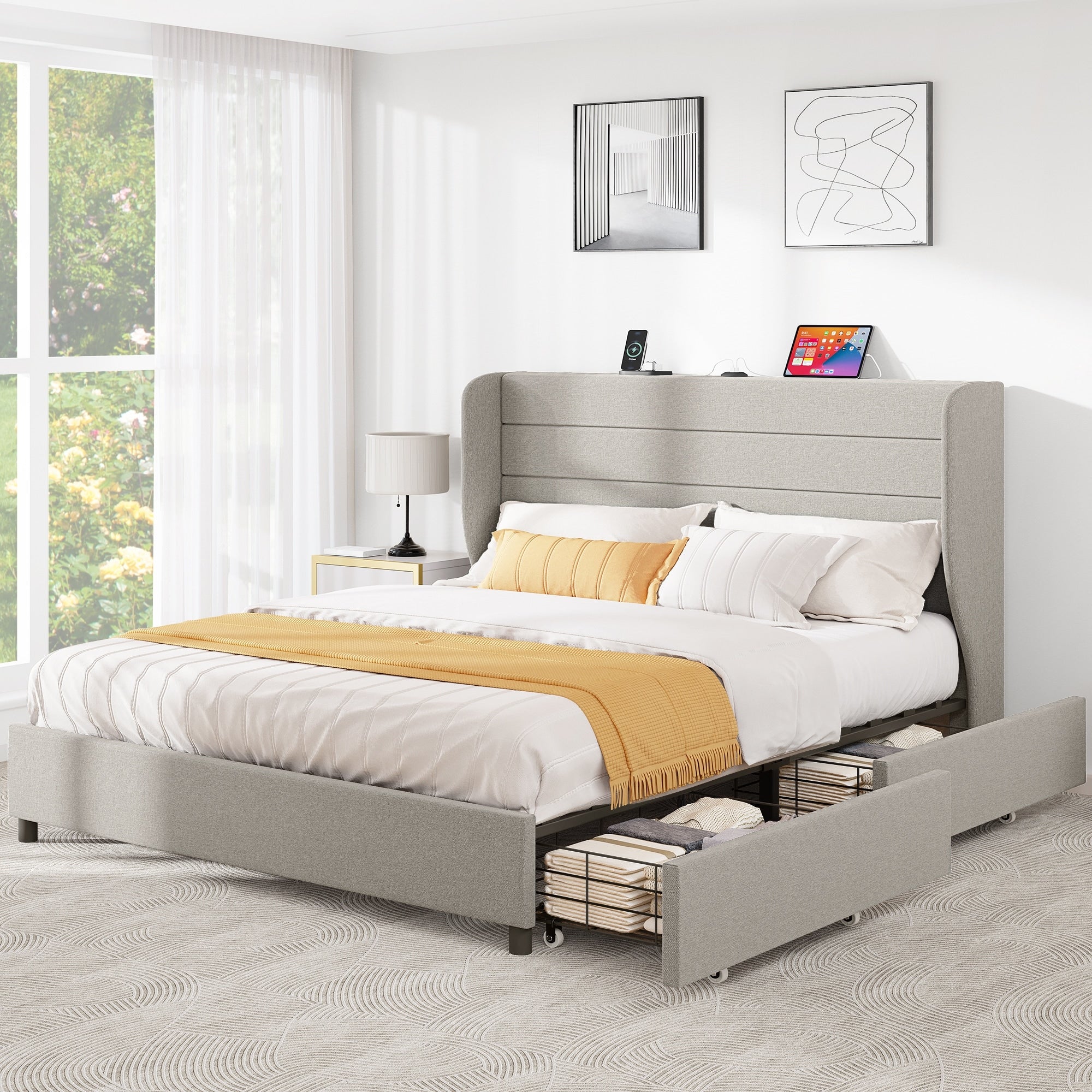 Moasis Queen Linen Upholstery Wingback Headboard Bed Frame