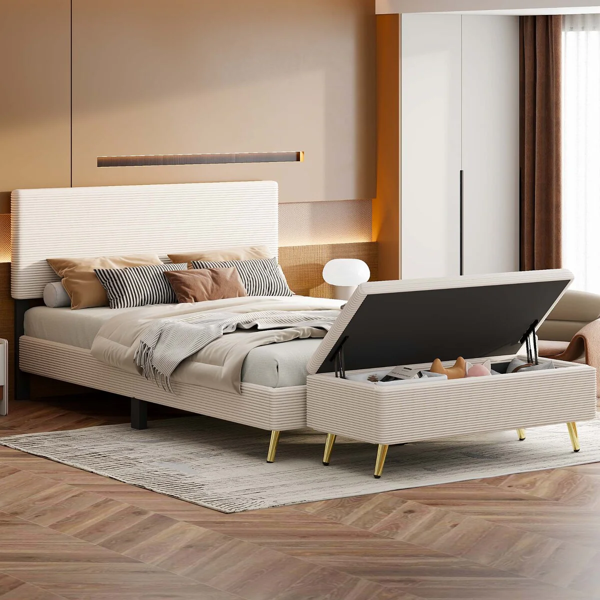 2-Pieces Bedroom Sets,Upholstered LED Platform Bed w/Storage Ottoman