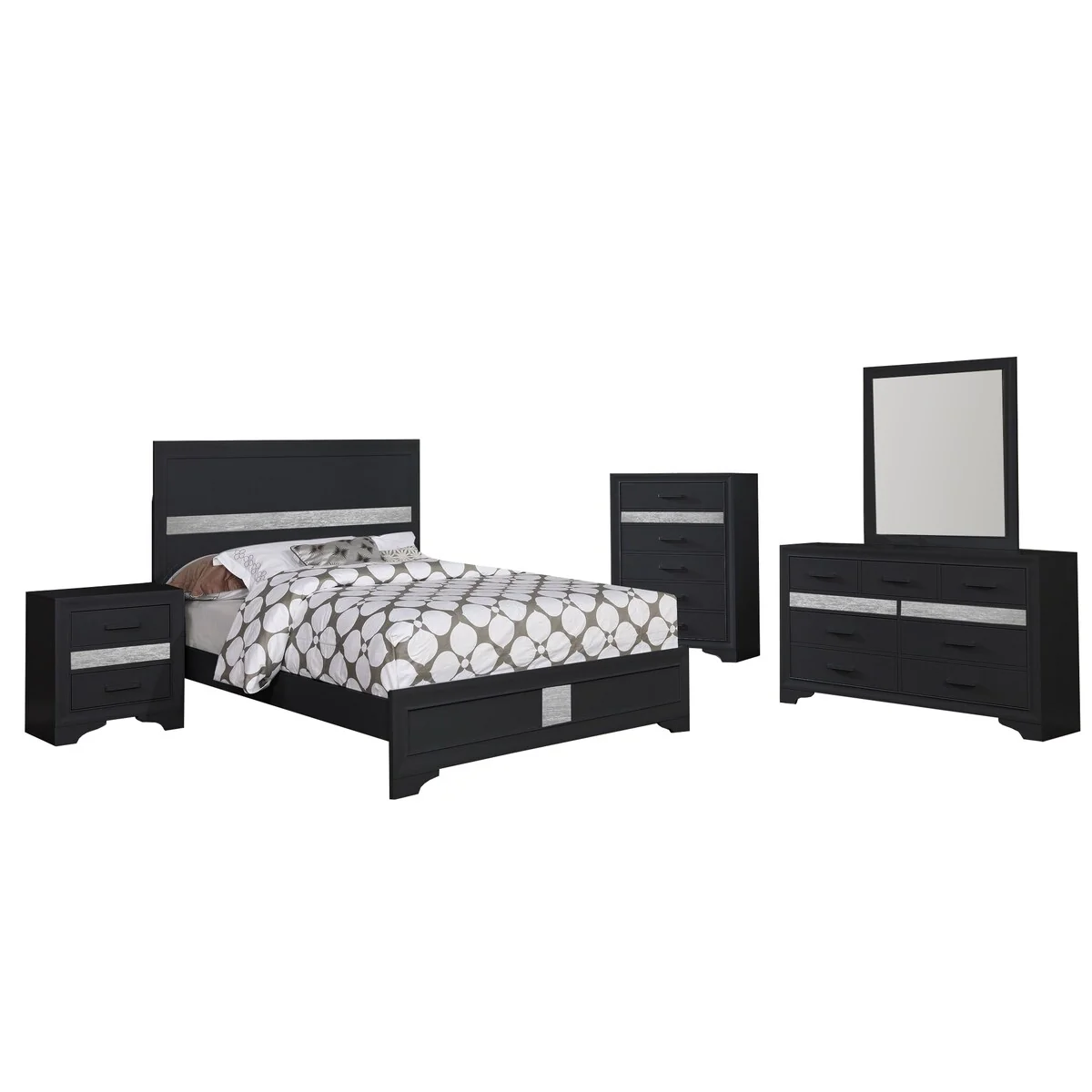 5 Piece Wooden Full Bedroom Set, Black and Silver