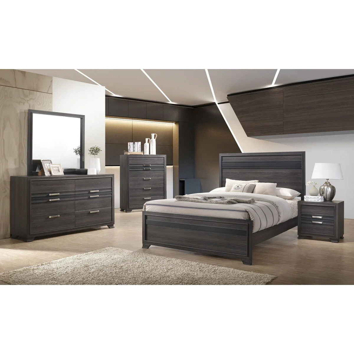 Nexera Alibi 4 Piece Bedroom Set, Walnut and Charcoal