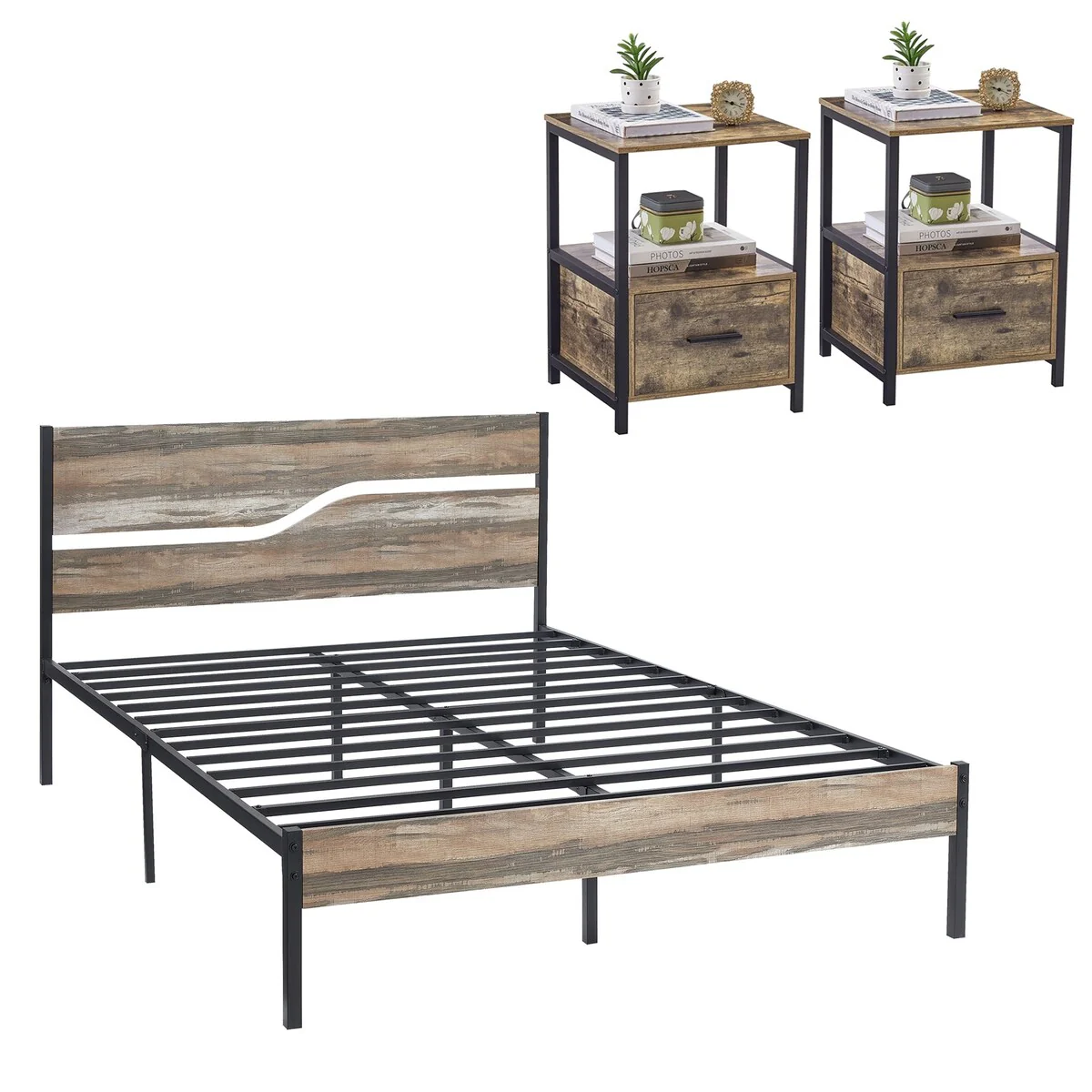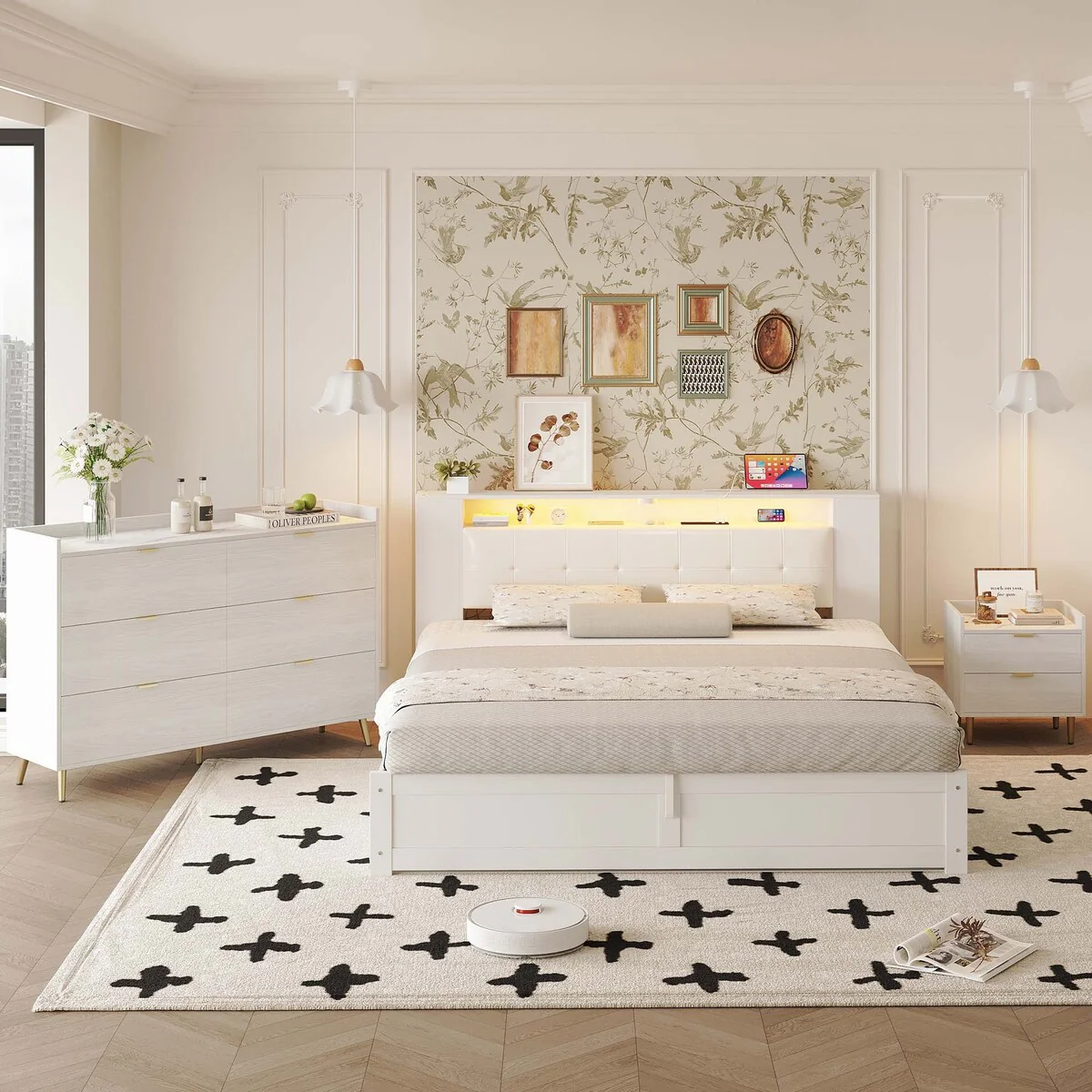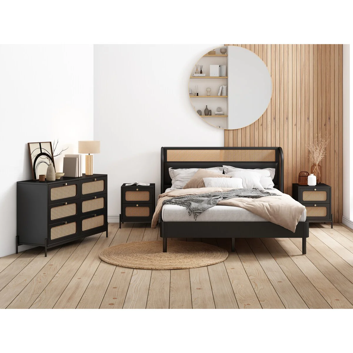 Modern Cannage Rattan Platform Queen Bed with Nightstand and Dresser