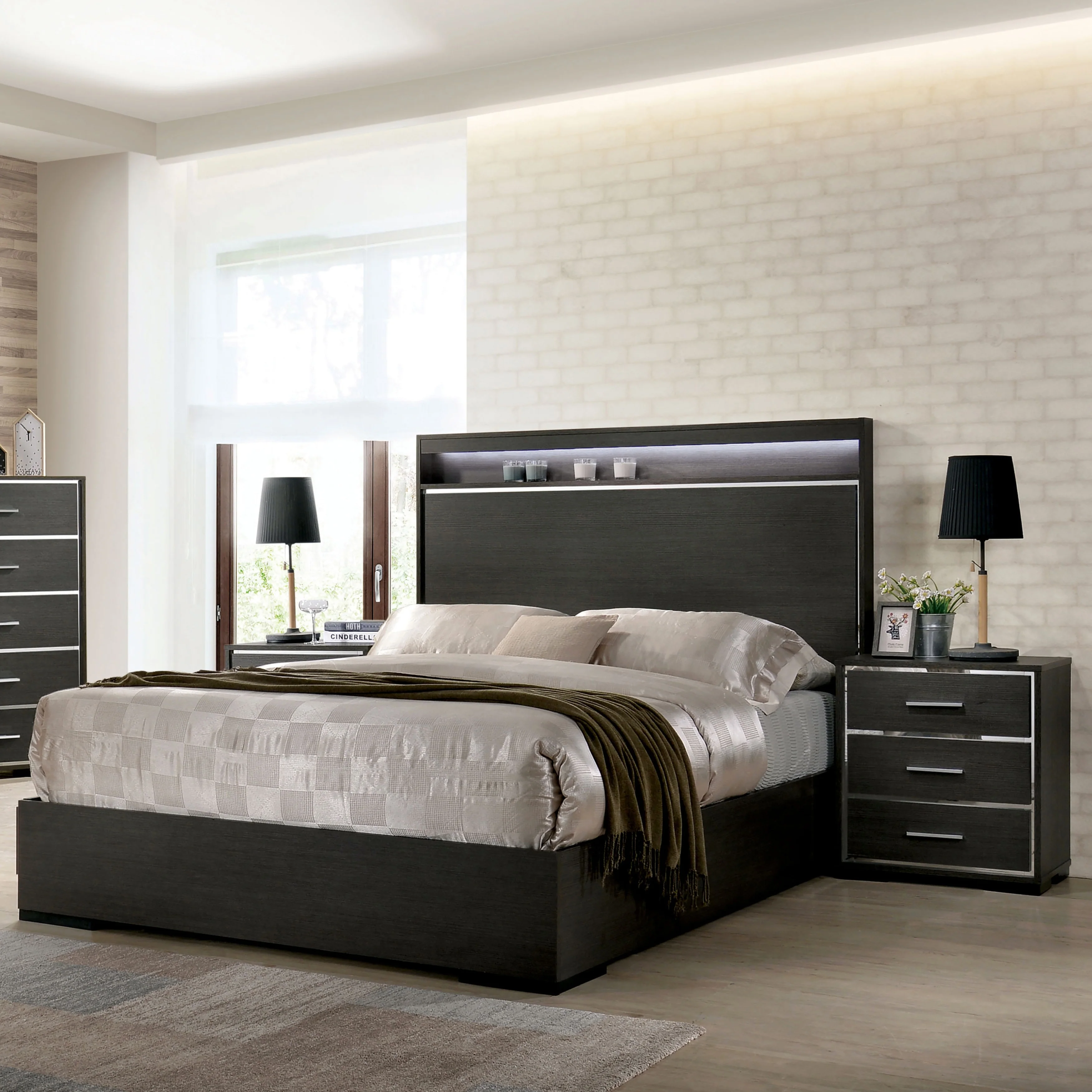 Contemporary Panel Built-in Bench Bed Light Gray Master Bedroom Set