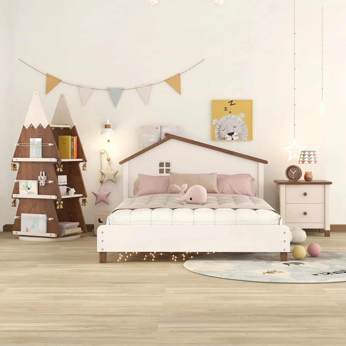 House Bed with Nightstand and Rotating Storage Shelf