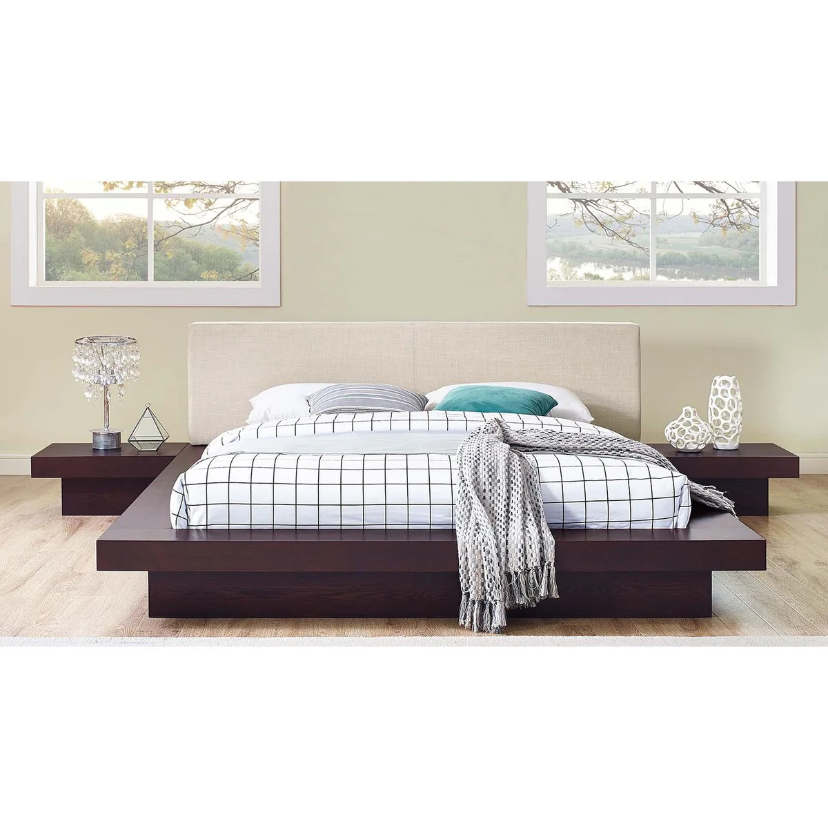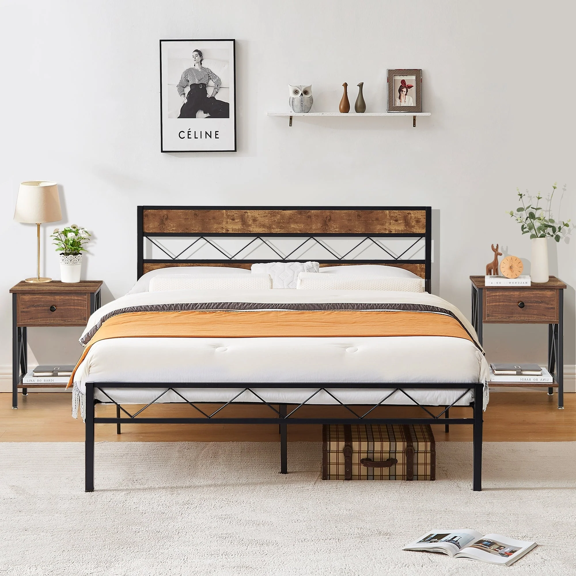 3 Pieces Bedroom Sets Wood Platform Bed with Headboard