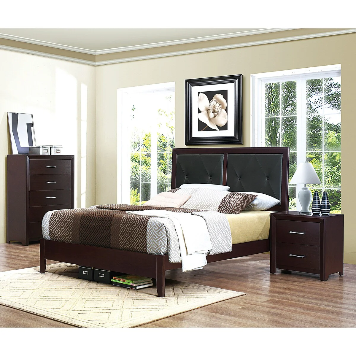 Contemporary 3pc Bedroom Espresso Finish Bed Chest Nightstand Set