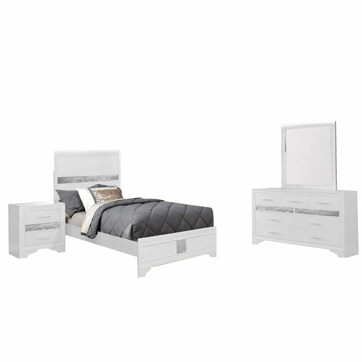 4 Piece Wooden Twin Bedroom Set, White and Silver