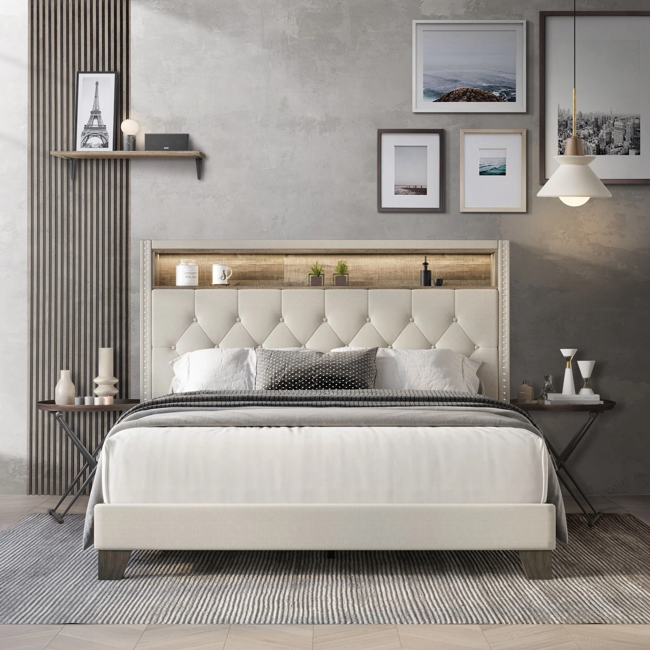 Bed Frame with Storage Headboard & Type-C Charging Station