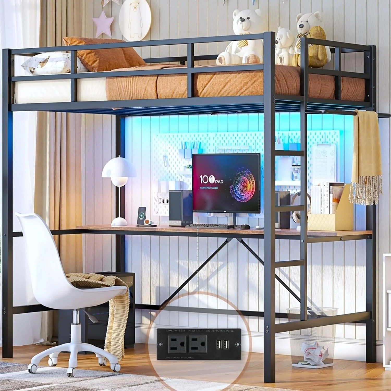 Loft Bed with Desk Gaming Bunk Bed LED Lights Charging Station