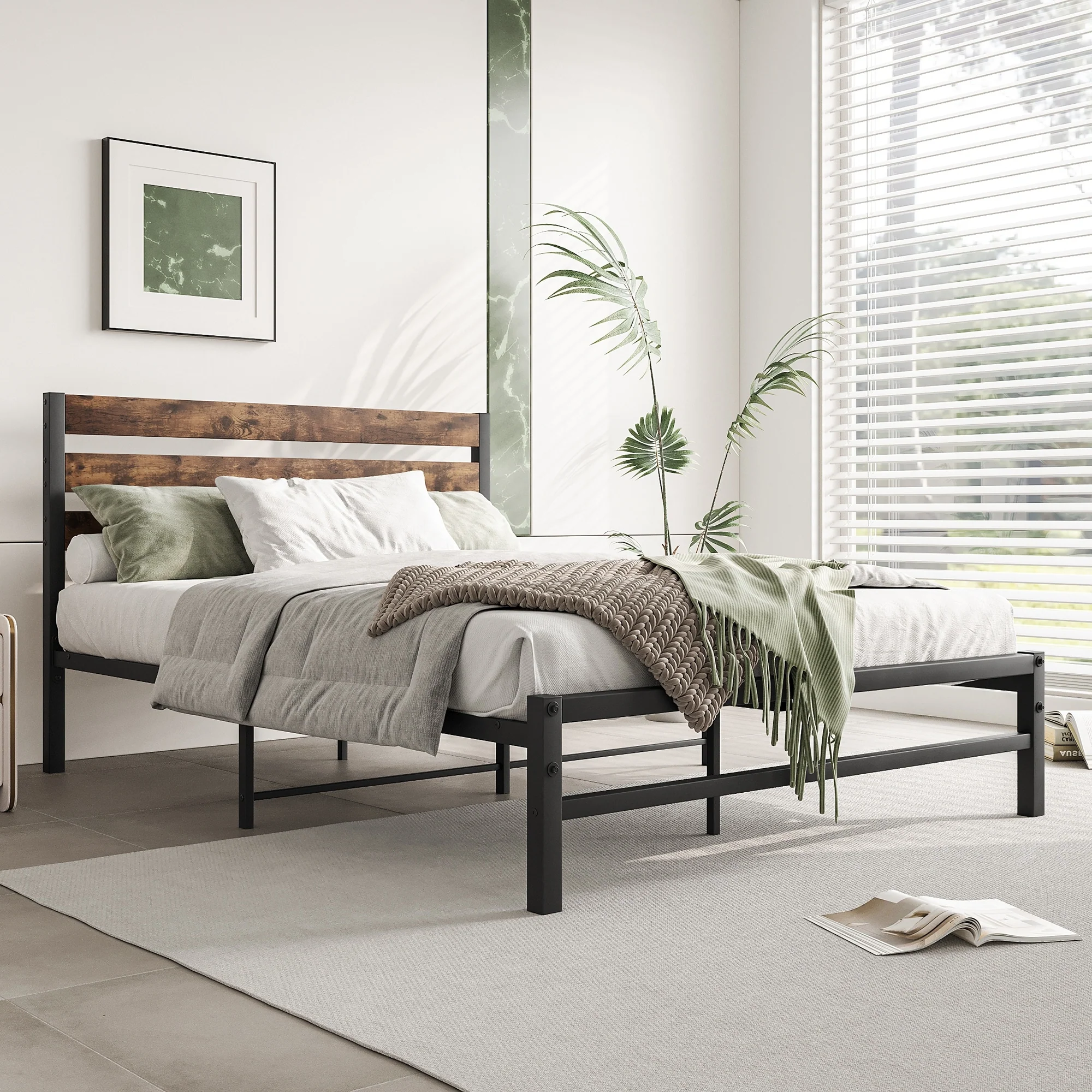 Full Size Platform Bed Frame with Rustic Vintage Wood Headboard
