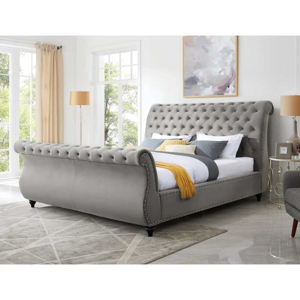 Roundhill Furniture Evora Grey Velvet Button-tufted Sleigh Bed