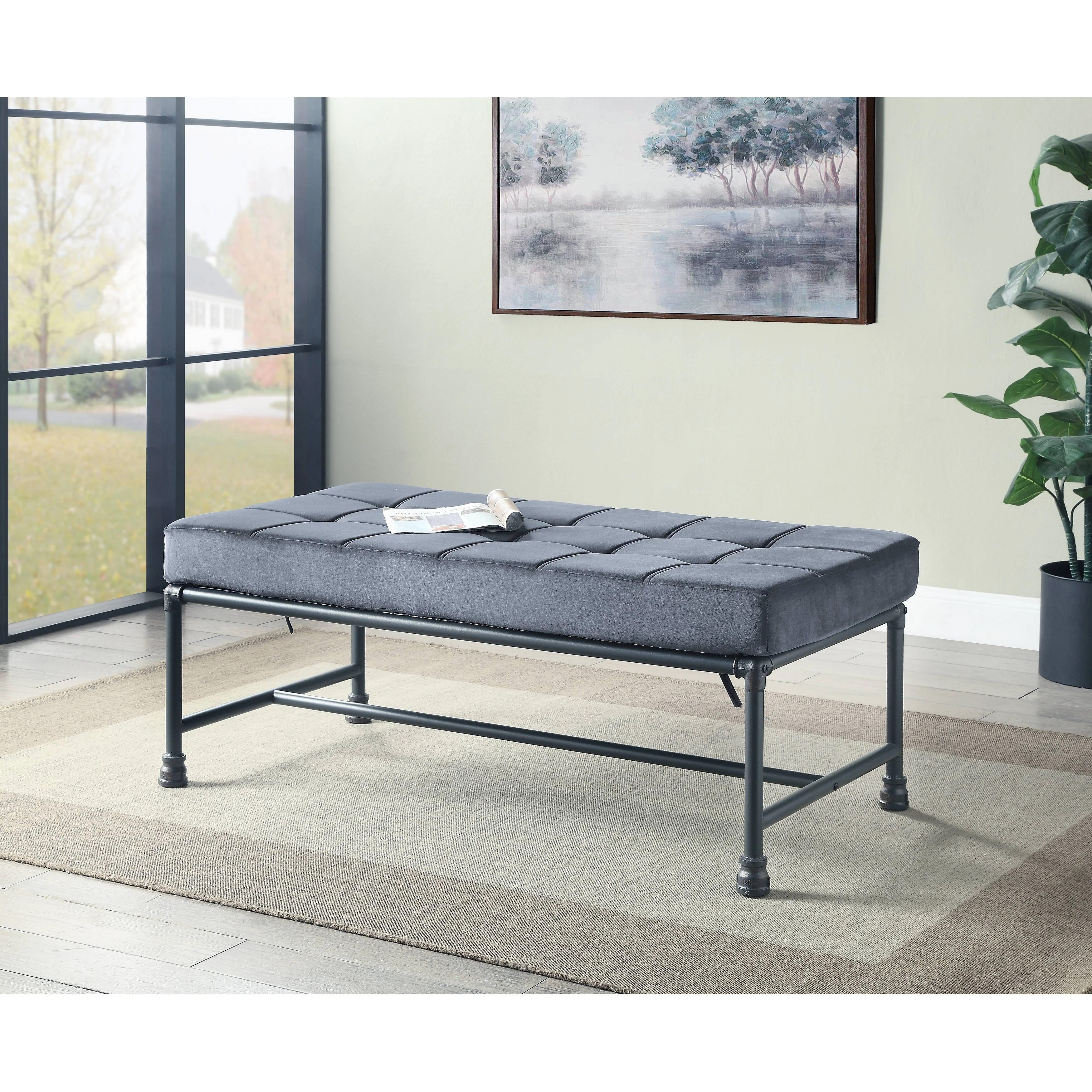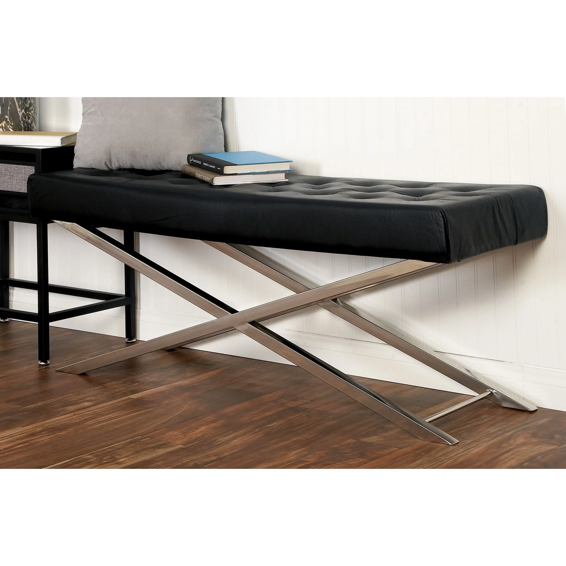 Amazing Black and Chrome Stainless Steel Tufted Leather Bench