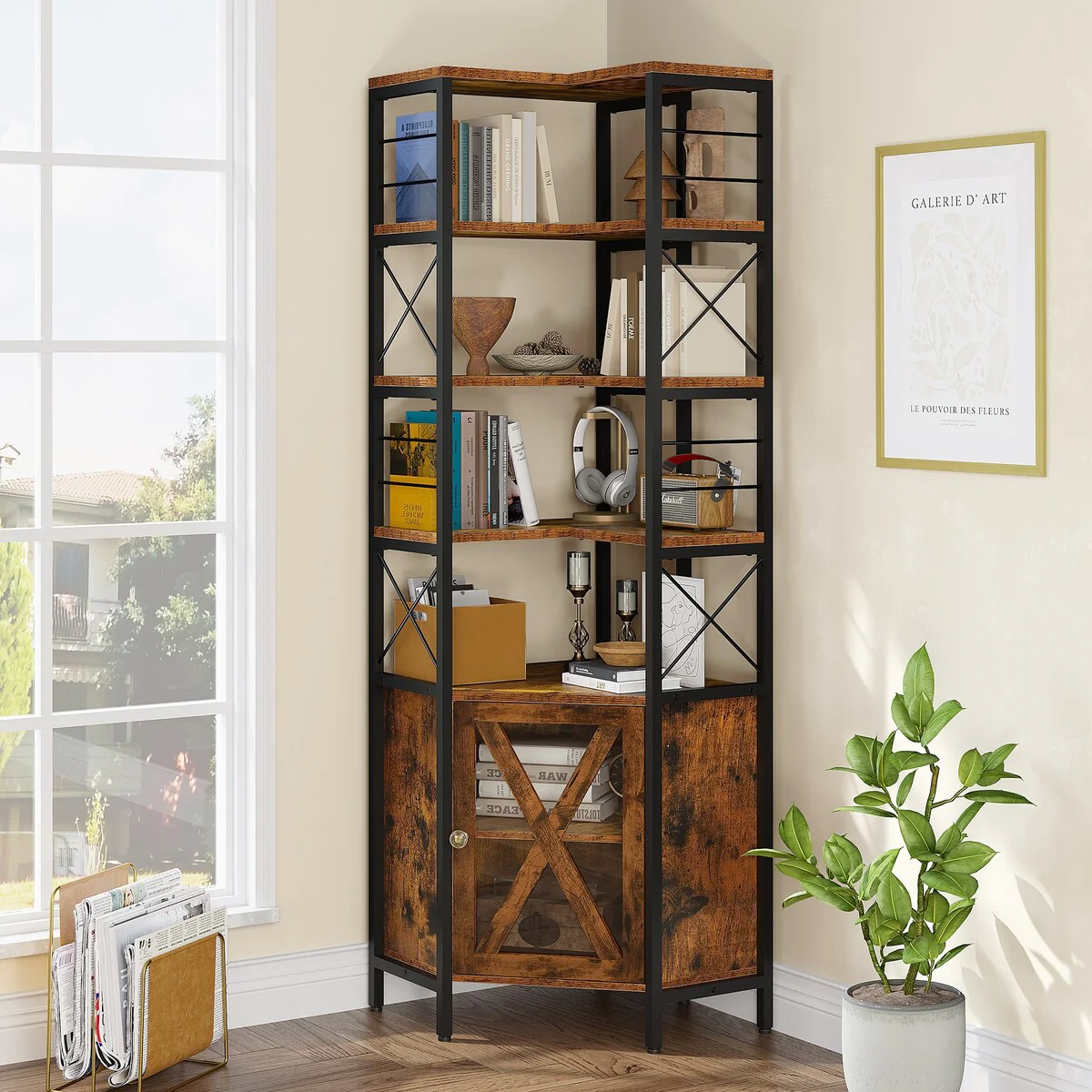 Industrial 6 Tier Tall Wood Bookcase with Metal Frame - N/A