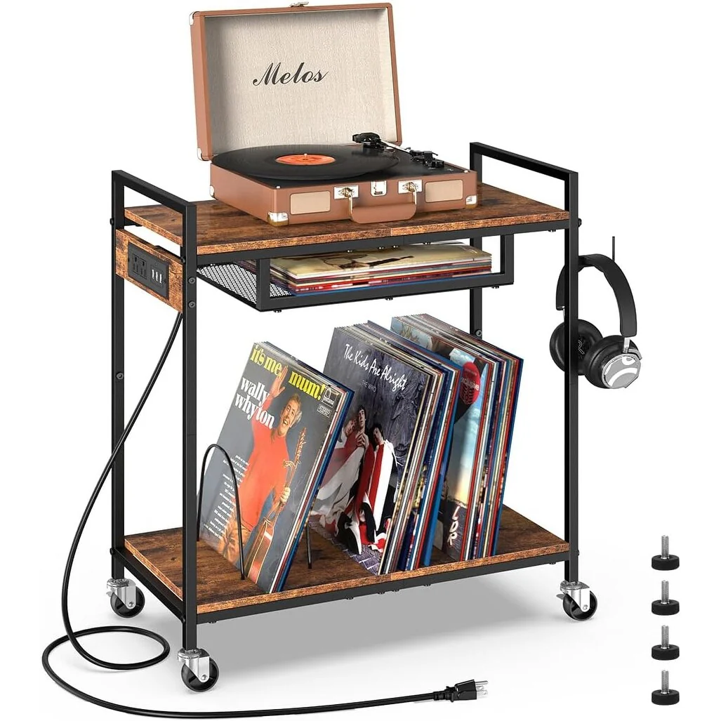 2 Tier Vinyl Record Player Table Stand with Charging Station