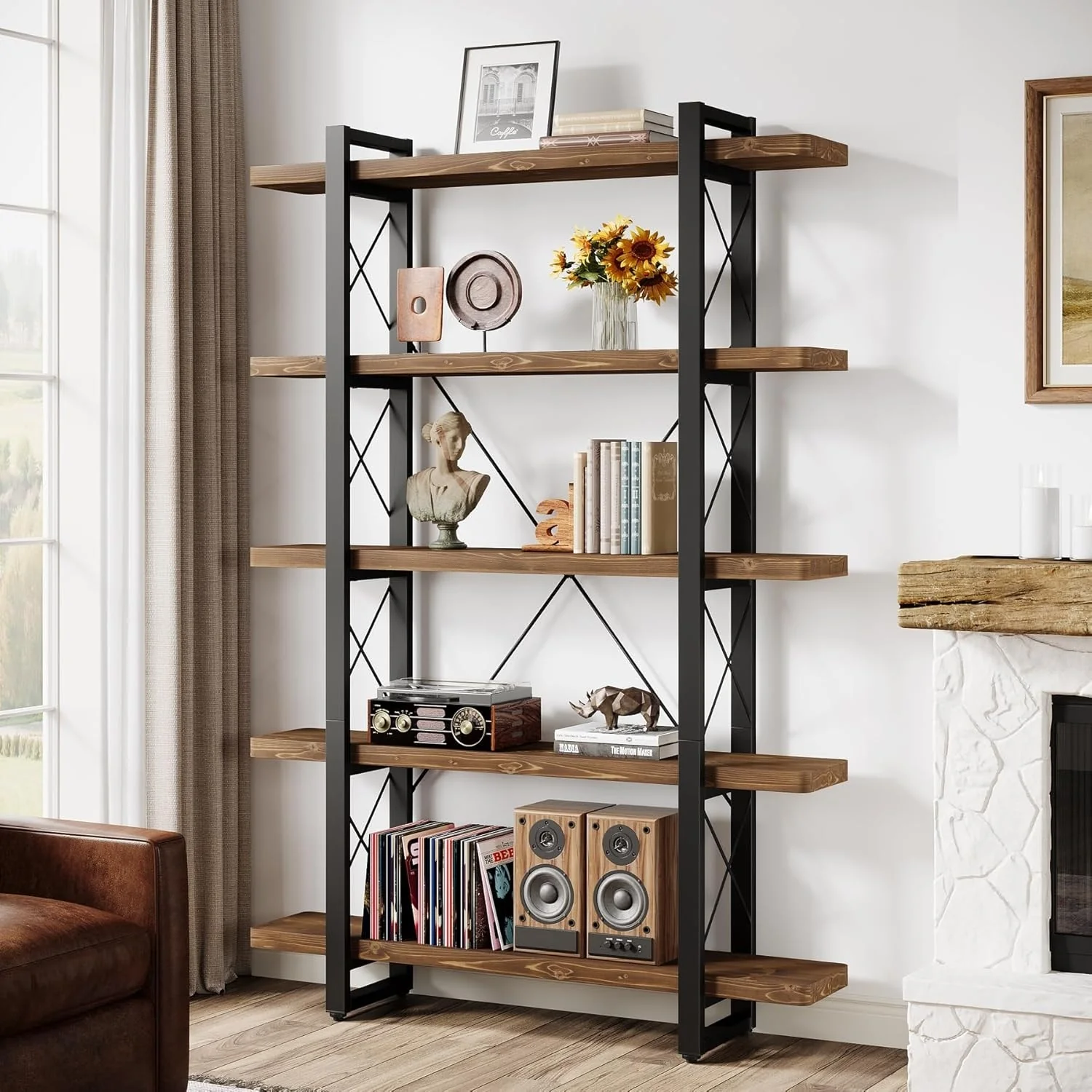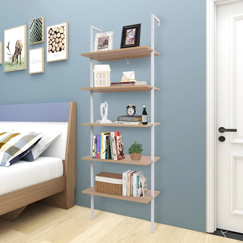 5-Tier Industrial Wood Ladder Bookcase with Metal Frame