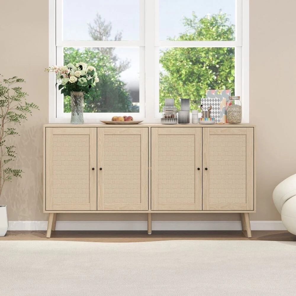 Rattan Buffet Storage Cabinet with 4 Doors and Shelf - N/A
