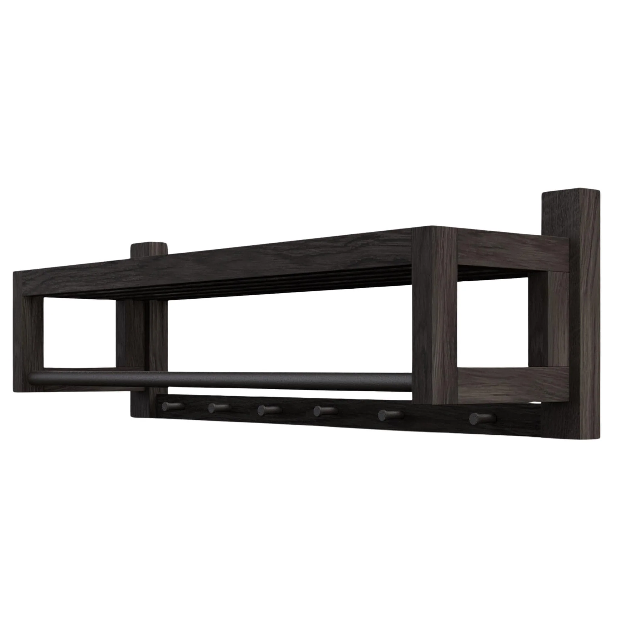 Solid Oak Hardwood Coat Rack - Black Metal Knobs & Hanger Bar