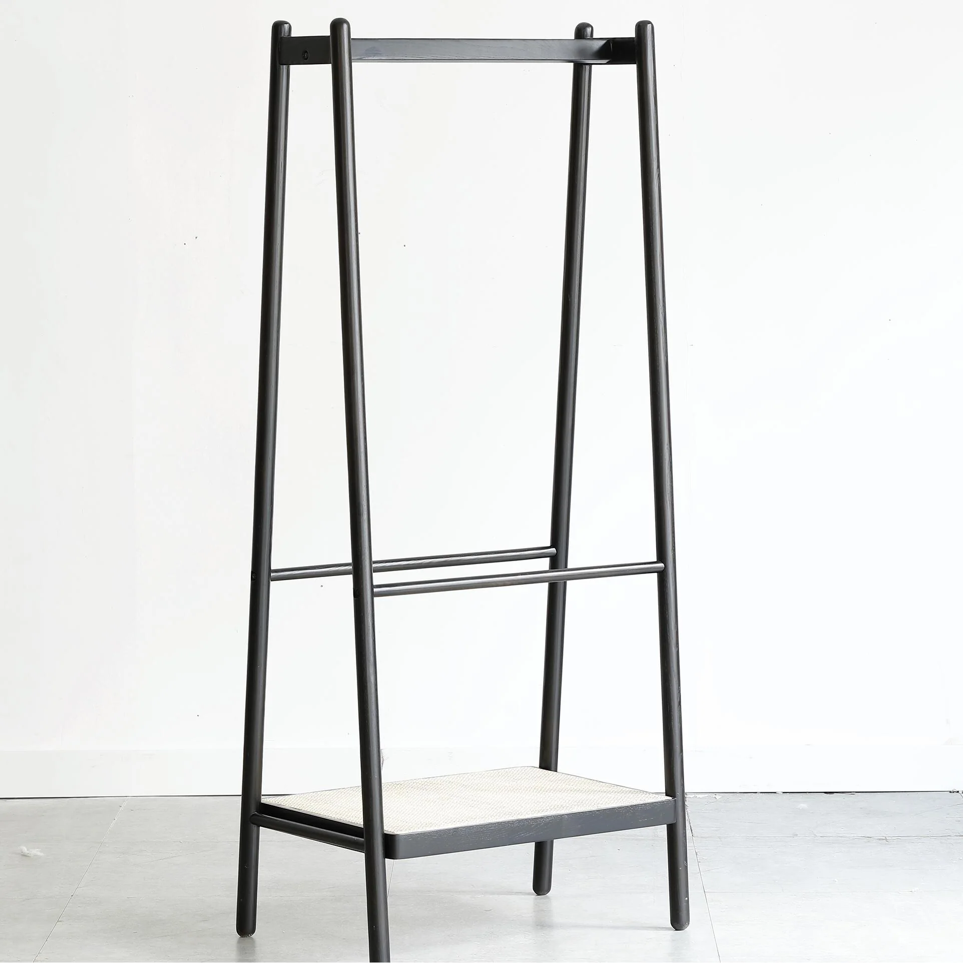 Solid Oak Clothes Rack with Rattan Shelves - Black