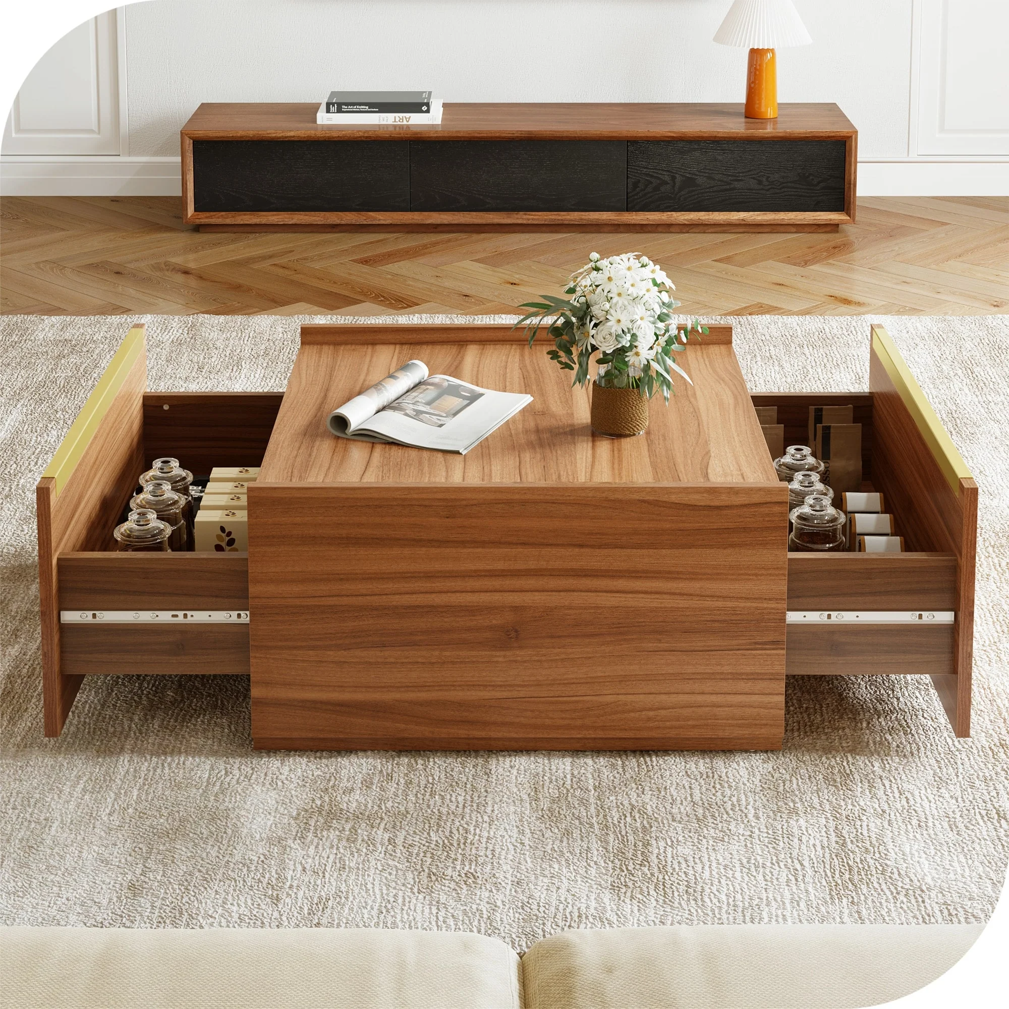 Walnut Square Coffee Table Sofa table with 2 Drawers