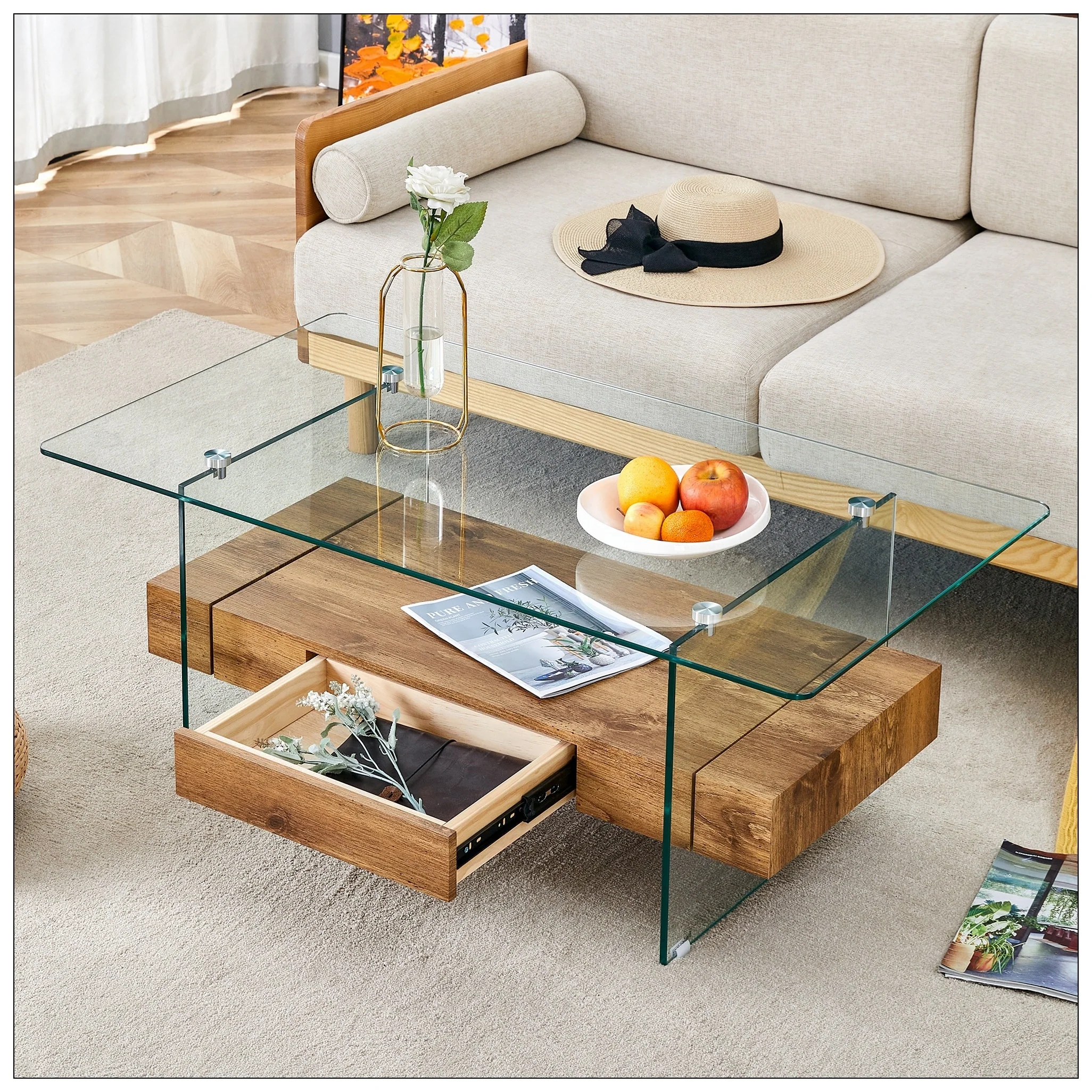 Modern Coffee Table with Drawer for Living Room,Solid Wood Legs