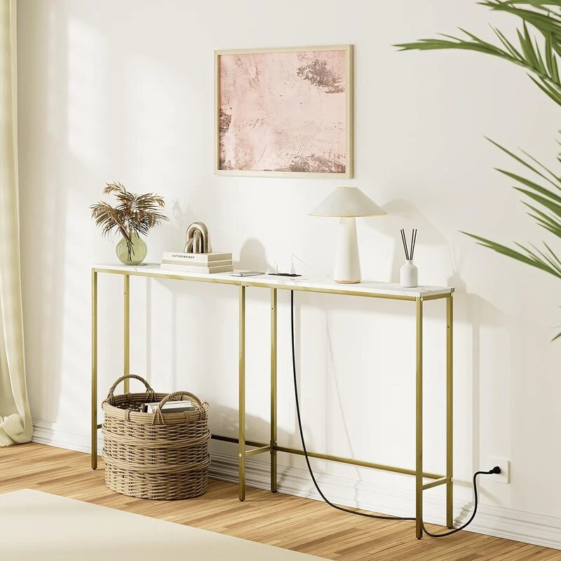Maypex White Quartz Stone Narrow Console Table with Black Base