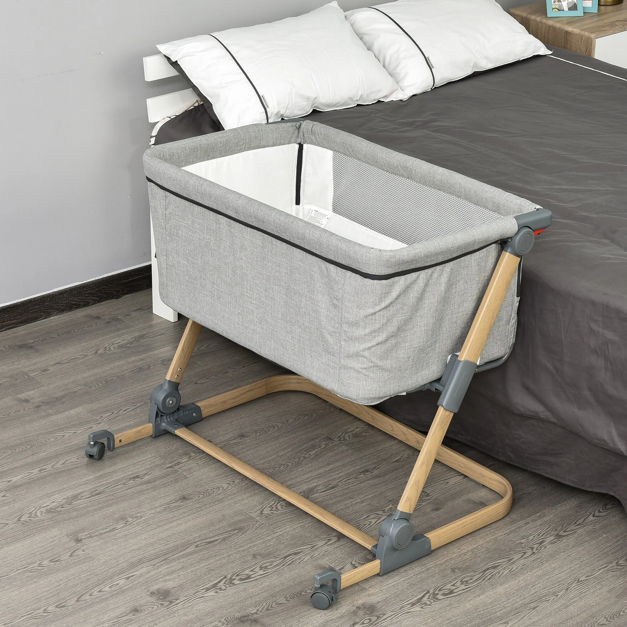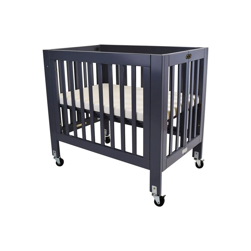 Foldable Wood and Metal Crib with Casters and Slatted Details, Gray