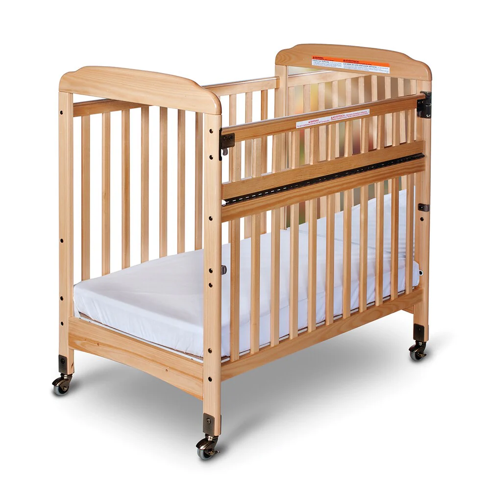 Foldable Wood and Metal Crib with Casters and Slatted Details, Brown