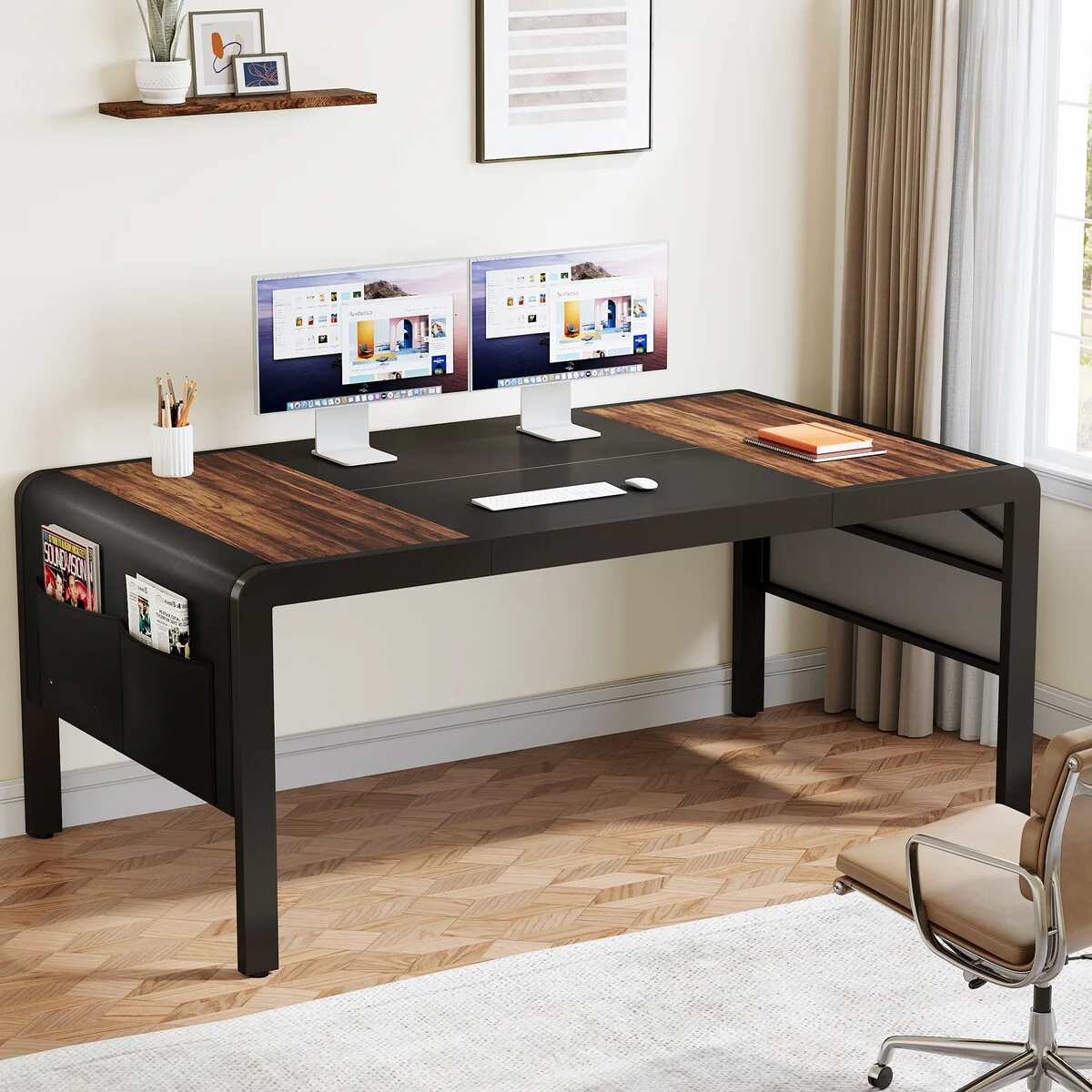 Wood Computer Desk with Metal Base and Storage Shelf