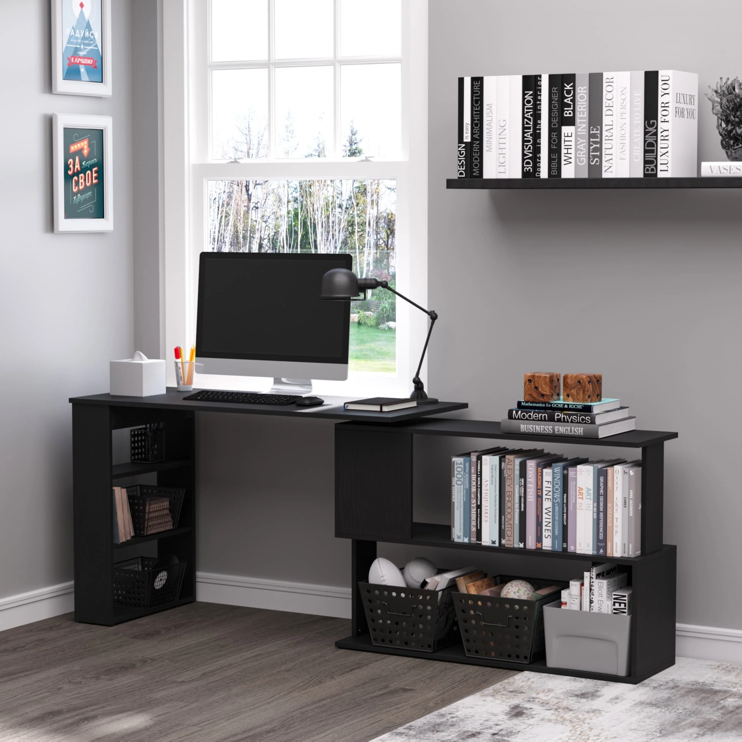 HomCom Modern L Shaped Rotating Computer Desk with Bookshelves