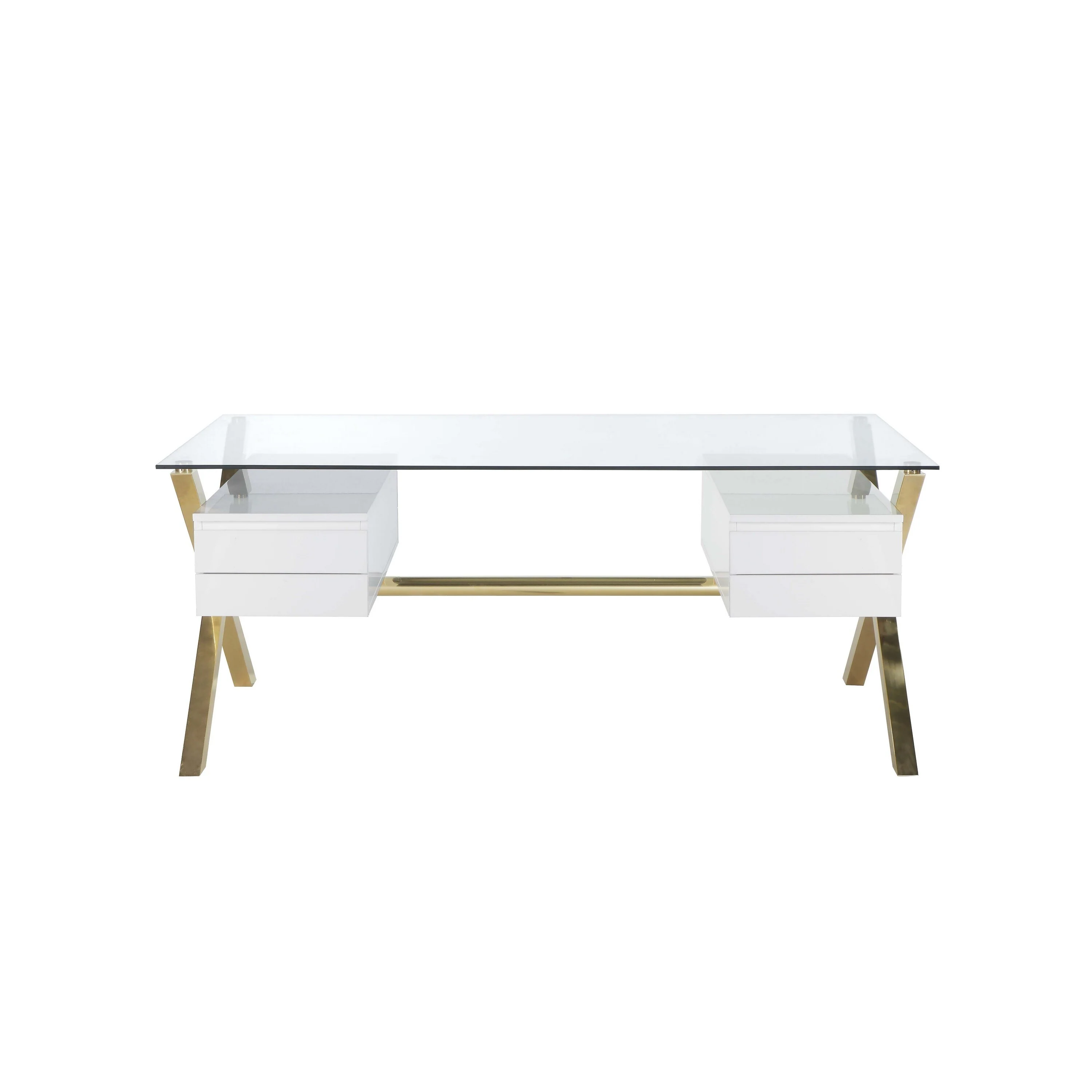 Tia Office Desk, 71 Inch Rectangular Glass, 4 Drawers, White, Gold