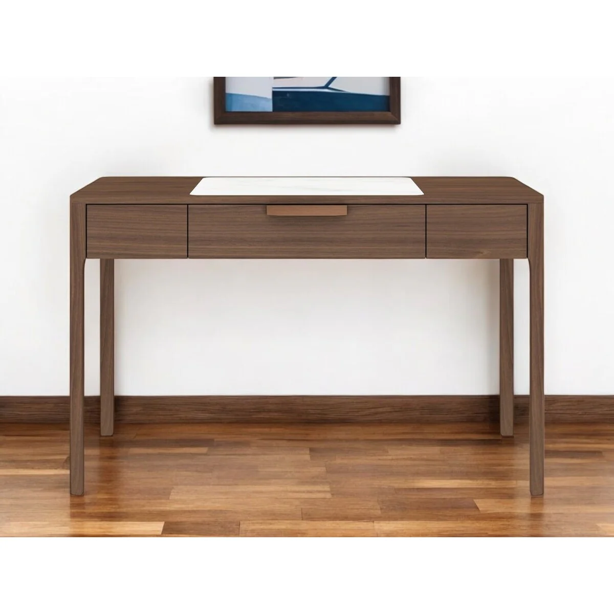 Dark Brown Wood Computer Desk with Gold Metal Base and 2 Drawers