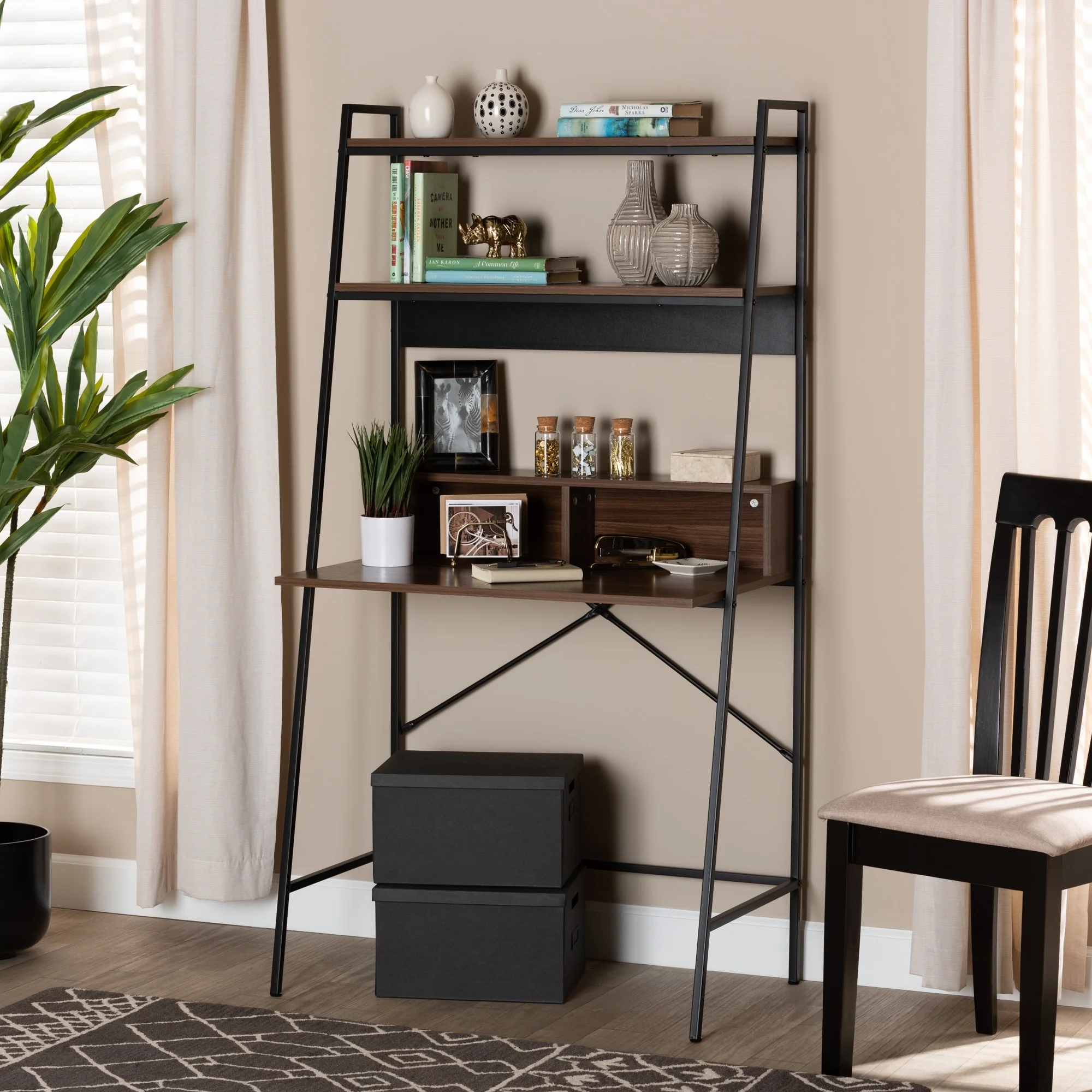 Palmira Industrial Wood and Metal Desk with Shelves-Walnut Brown