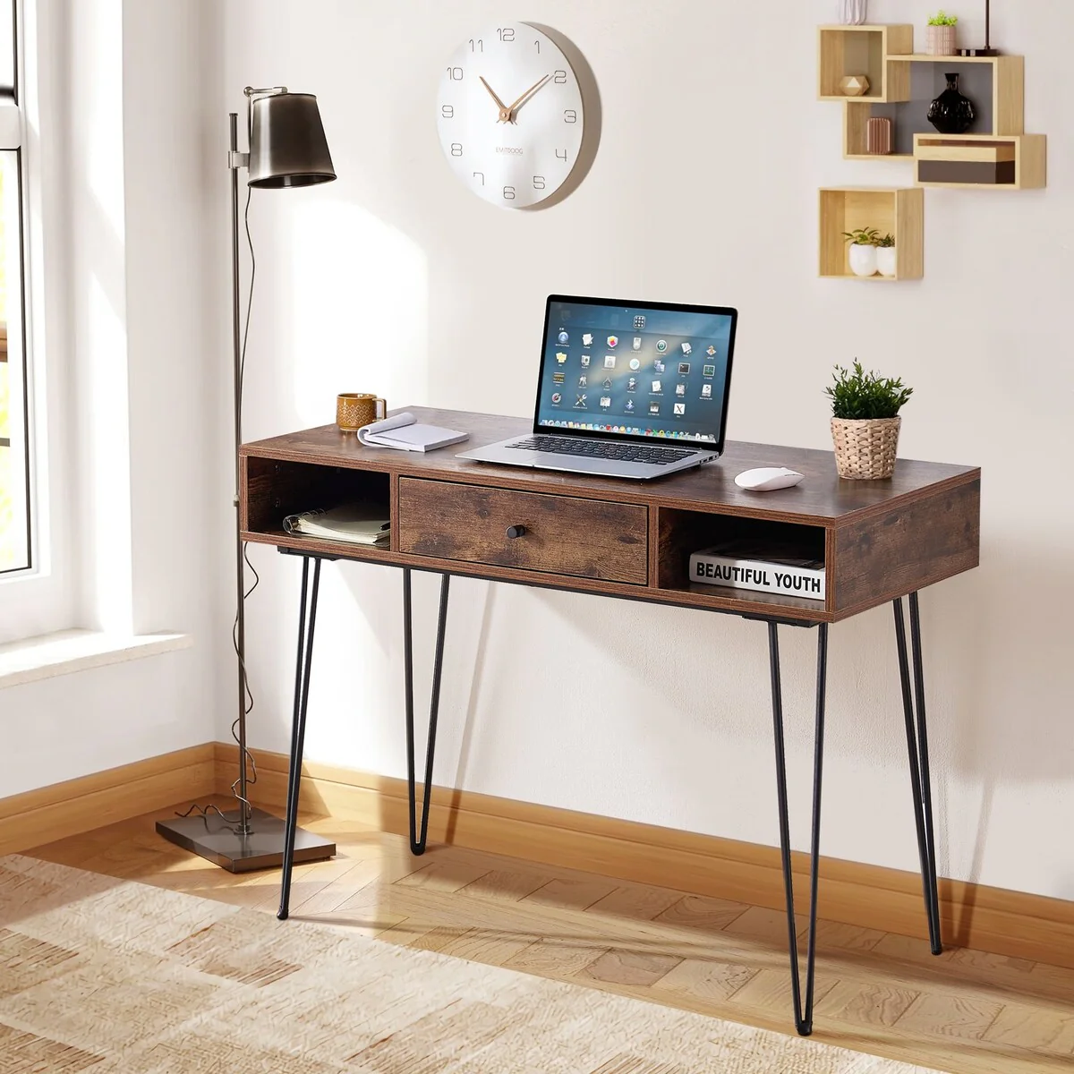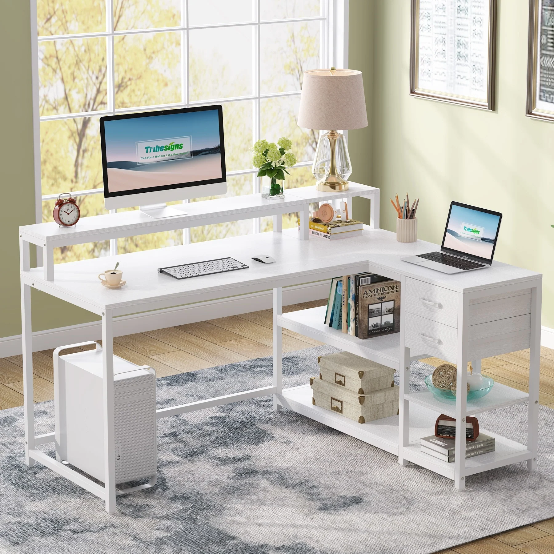 Modern L Shaped Computer Desk with Drawer and storage shelf
