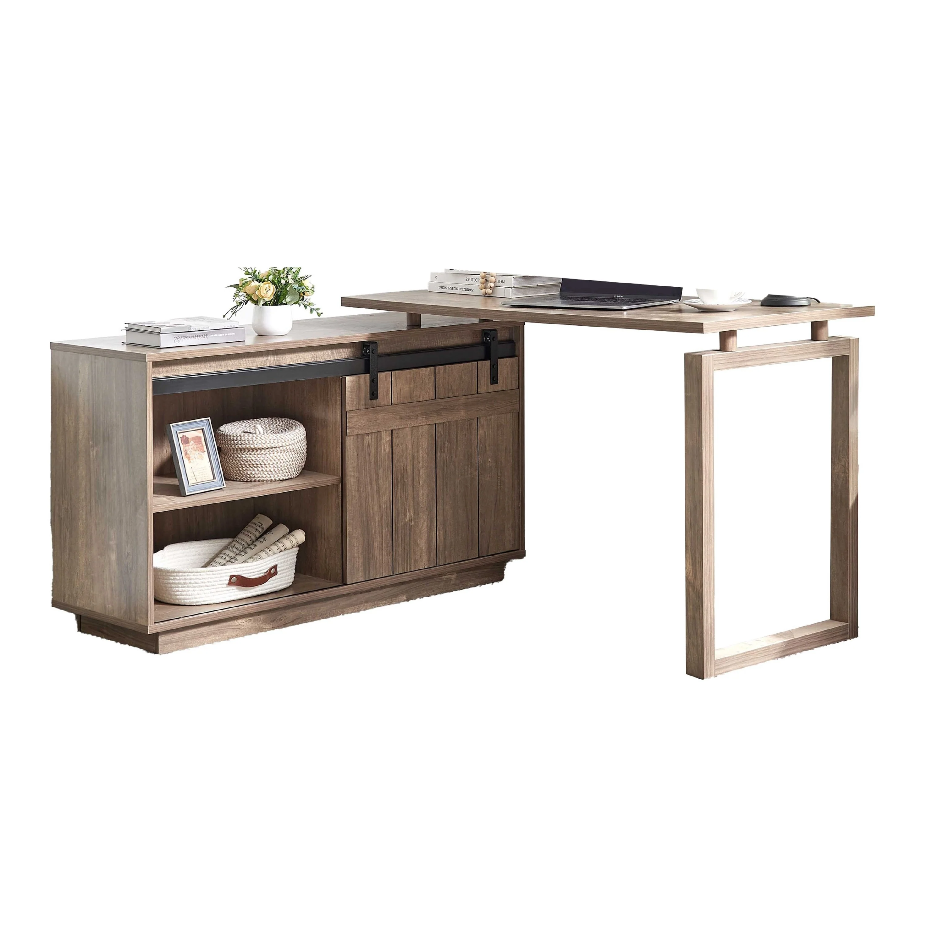 Fior L Shaped Writing Desk, 56 Inch, Hazelnut Brown Wood, Barn Door