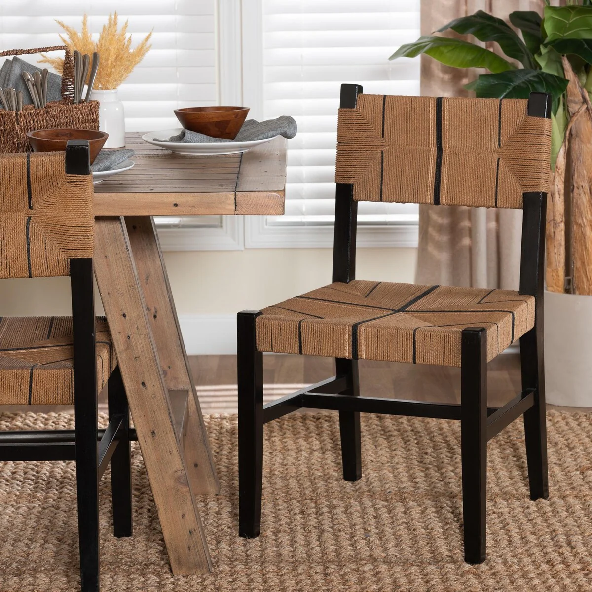 Prita Bohemian Paper Loom and Black Mahogany Wood Dining Chair