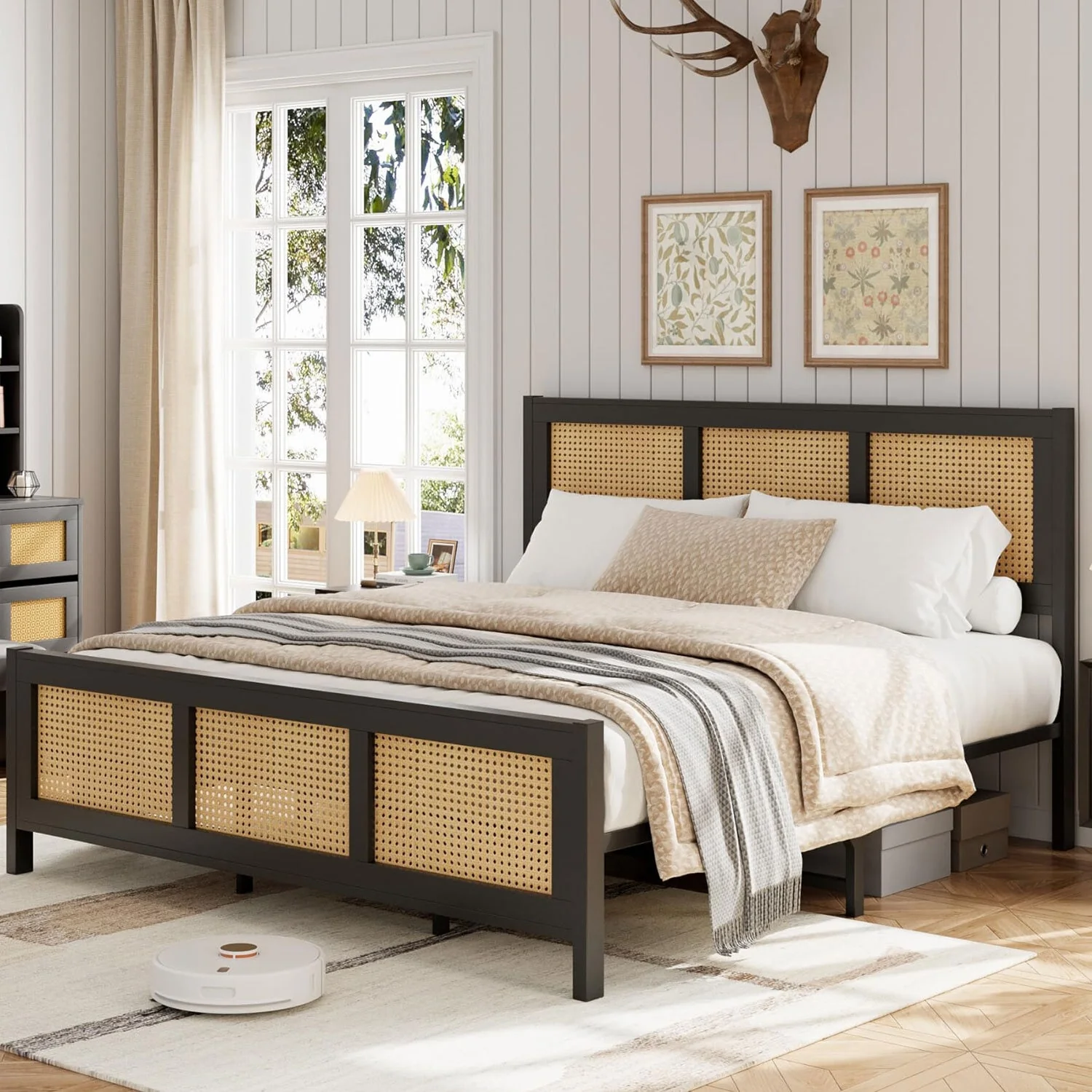 Rattan Black Platform Bed Frame with Strong Metal Slat