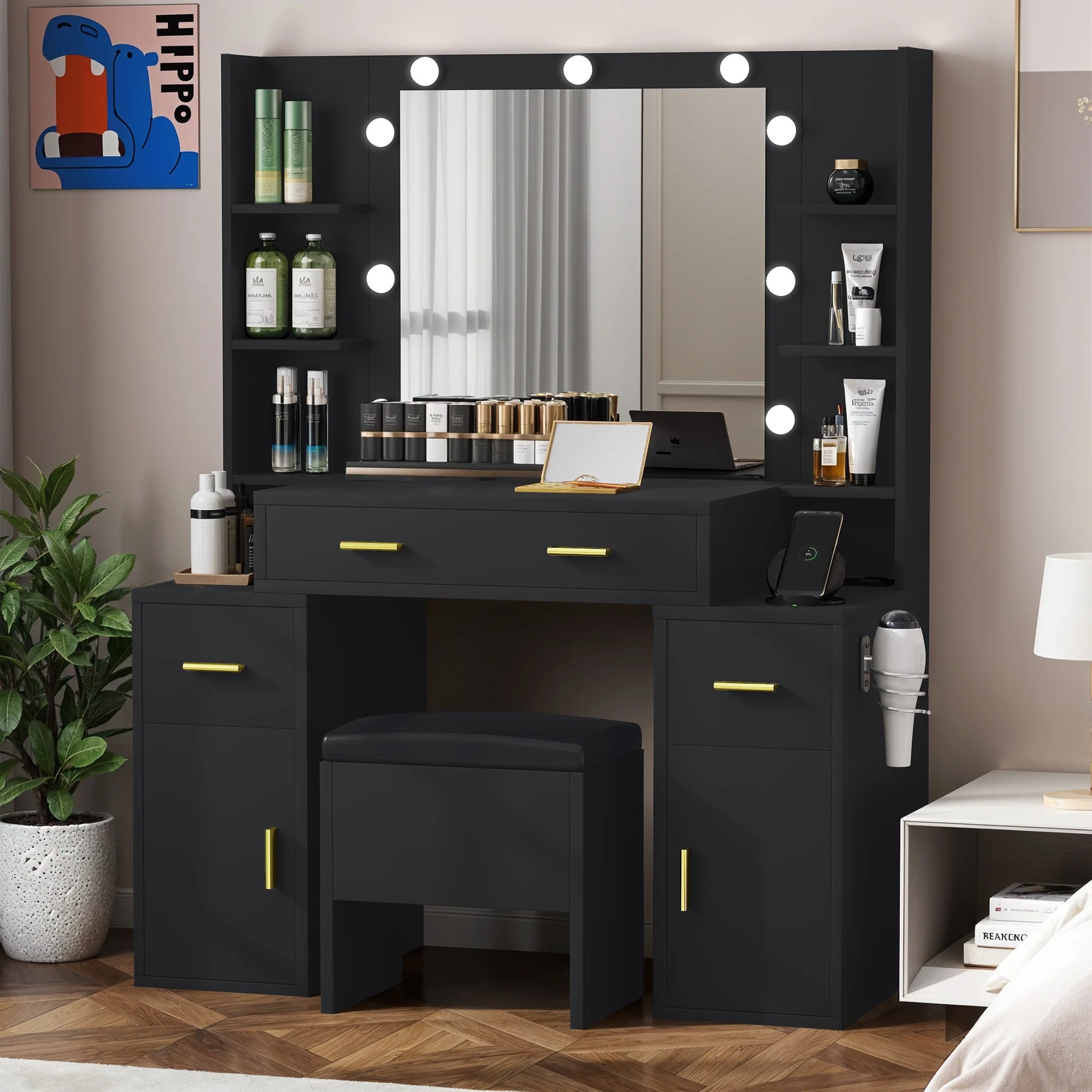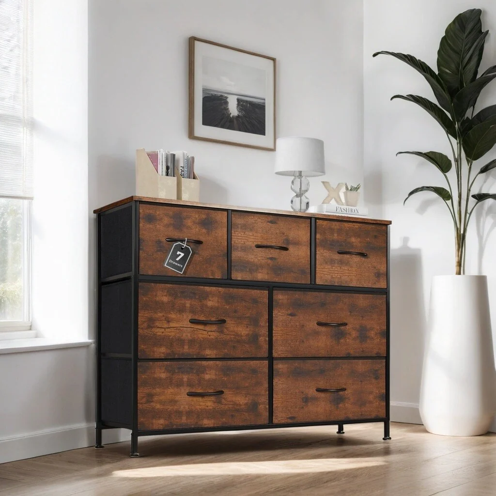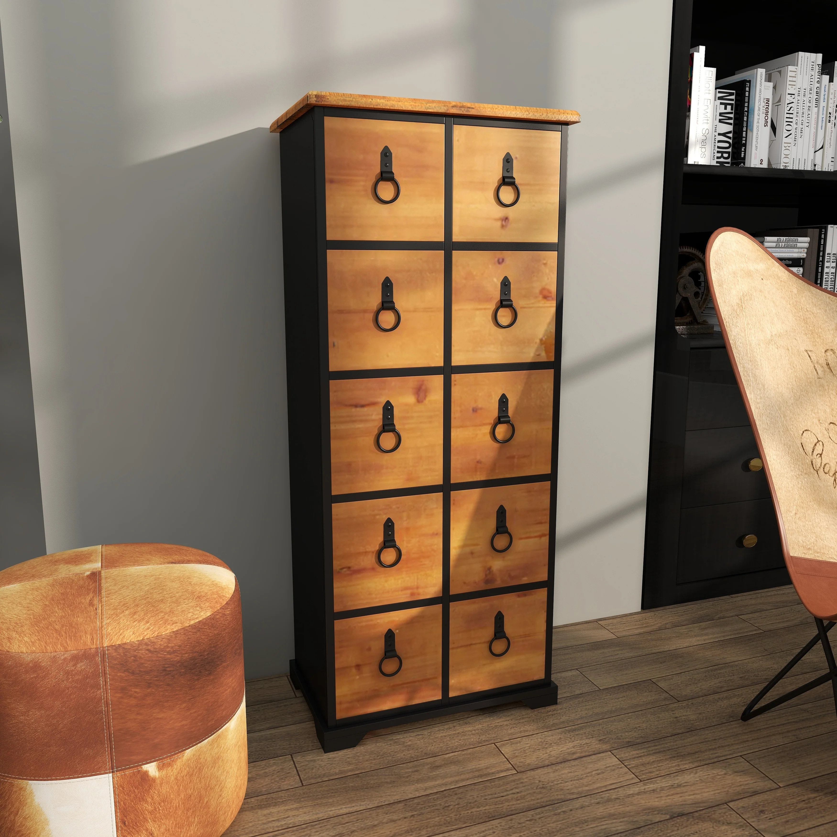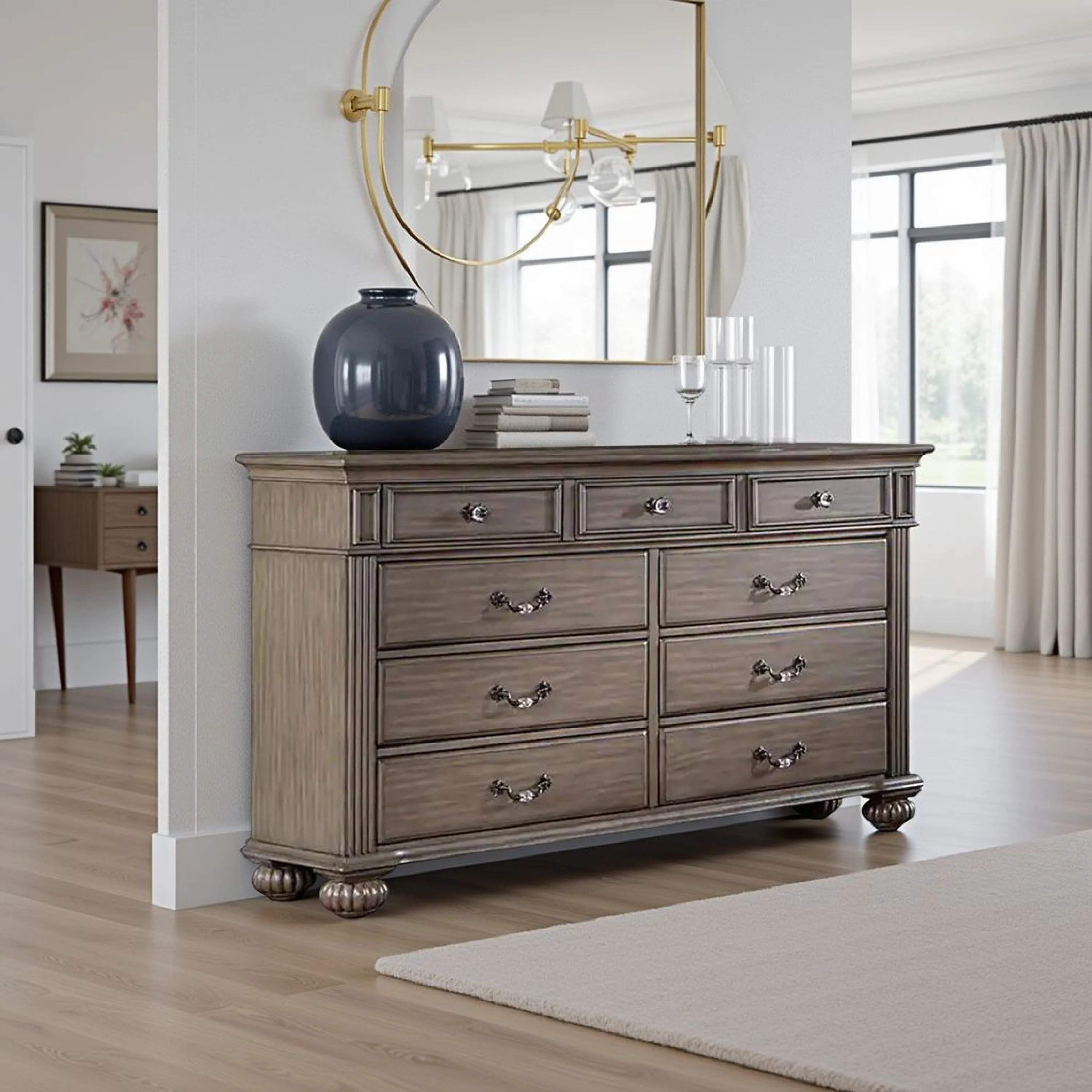 Recus Wide Dresser, 9 Drawers with Brass Handles, Gray Solid Wood