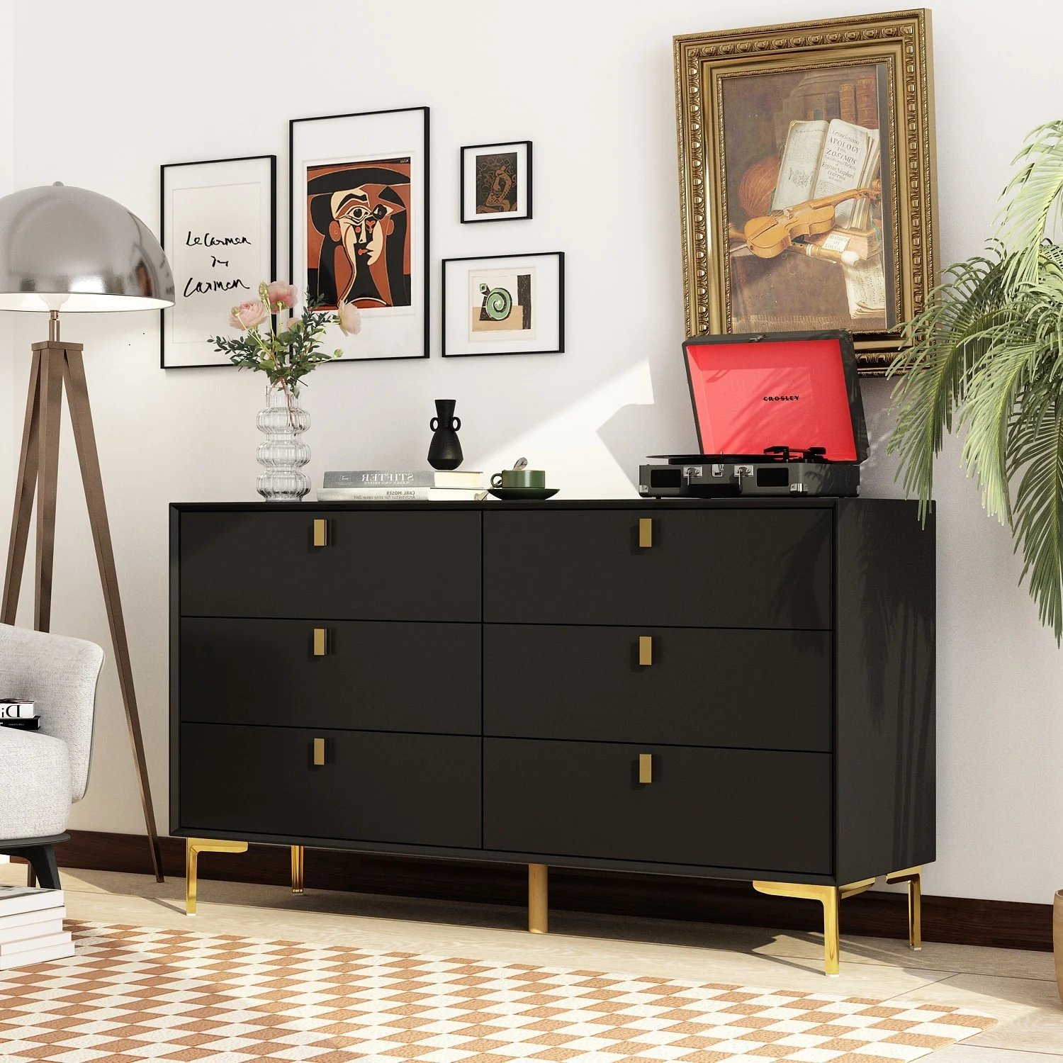 55.1W 6-Drawer Double Dresser Black Gold Storage Cabinet Chest