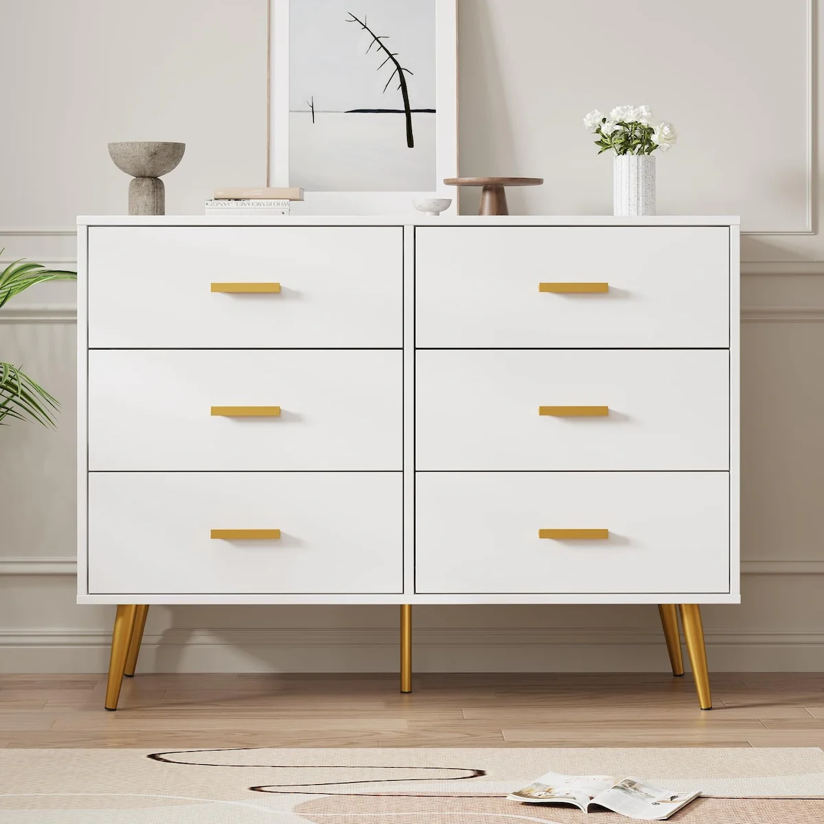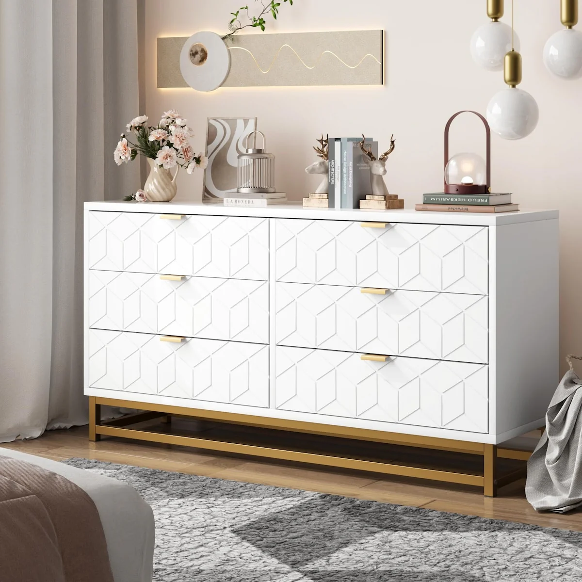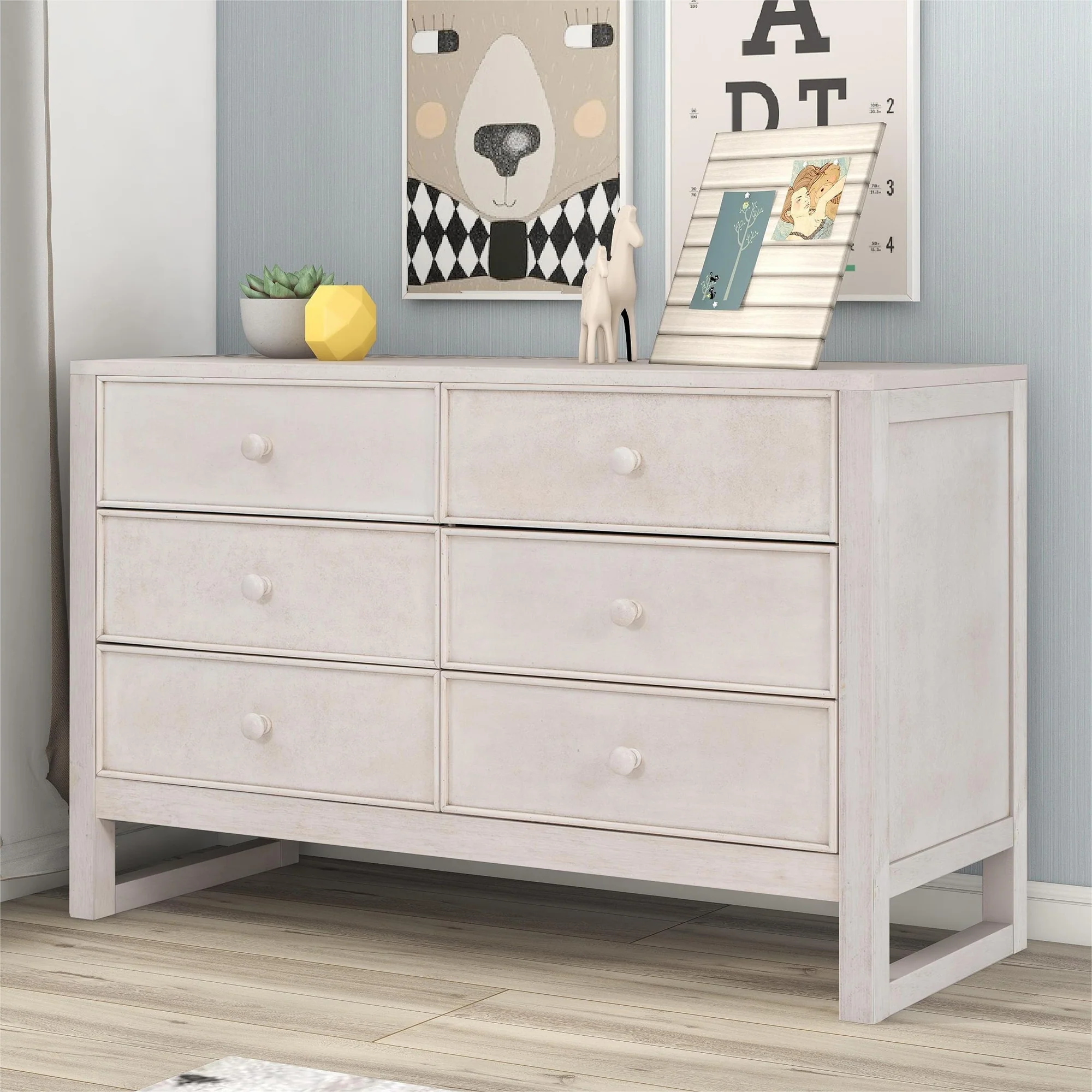 Modern Wooden 6 Drawer Dresser with Vintage Pattern Design
