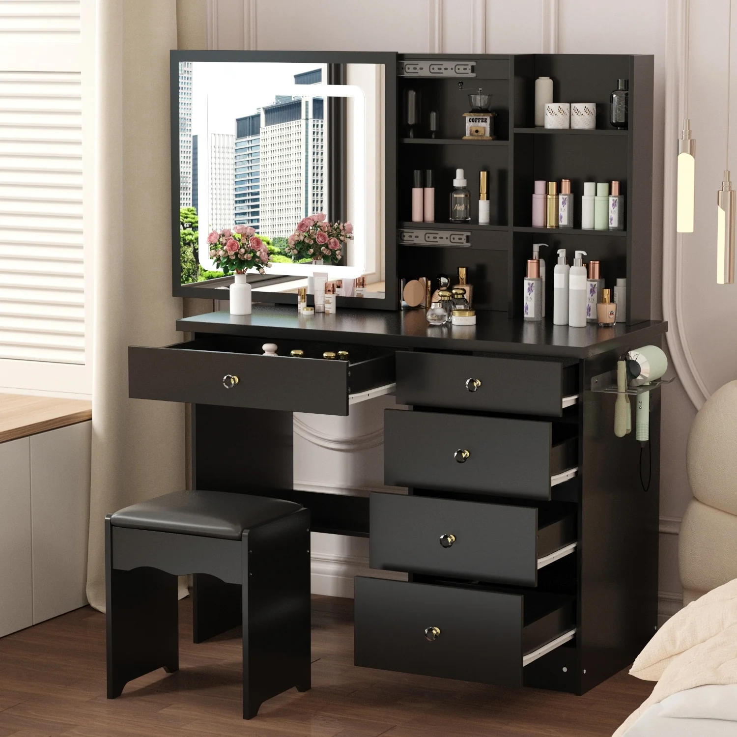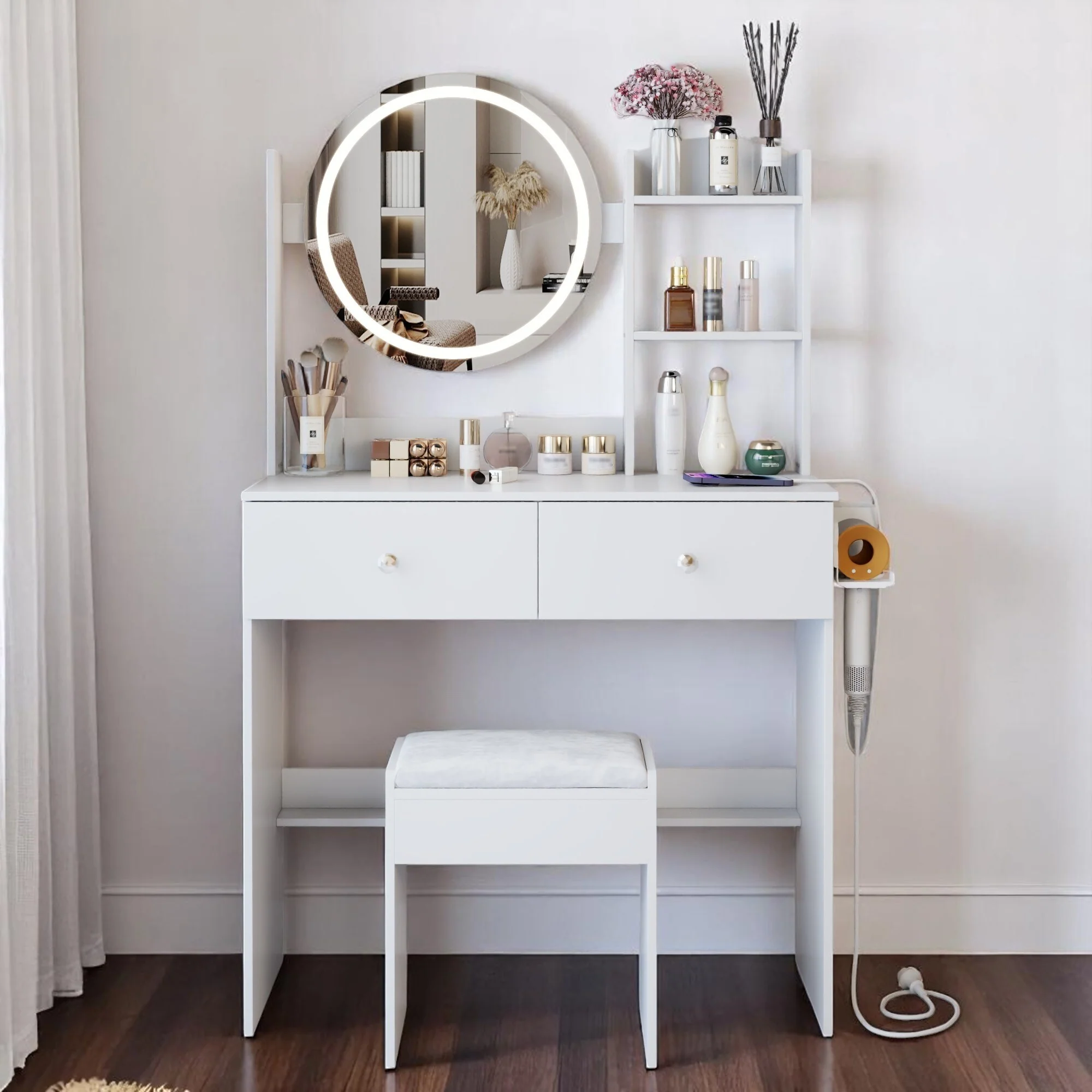 White Makeup Vanity Desk with Round Mirror