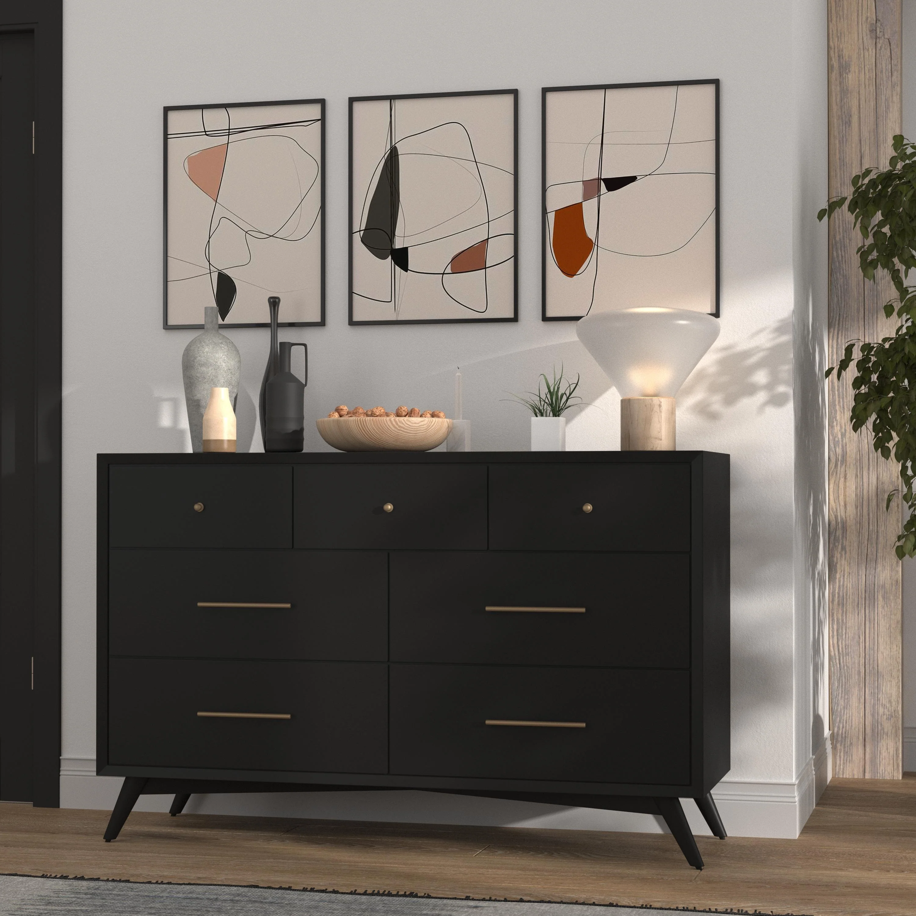Alpine Furniture Flynn Mid Century Modern 7 Drawer Dresser, Black