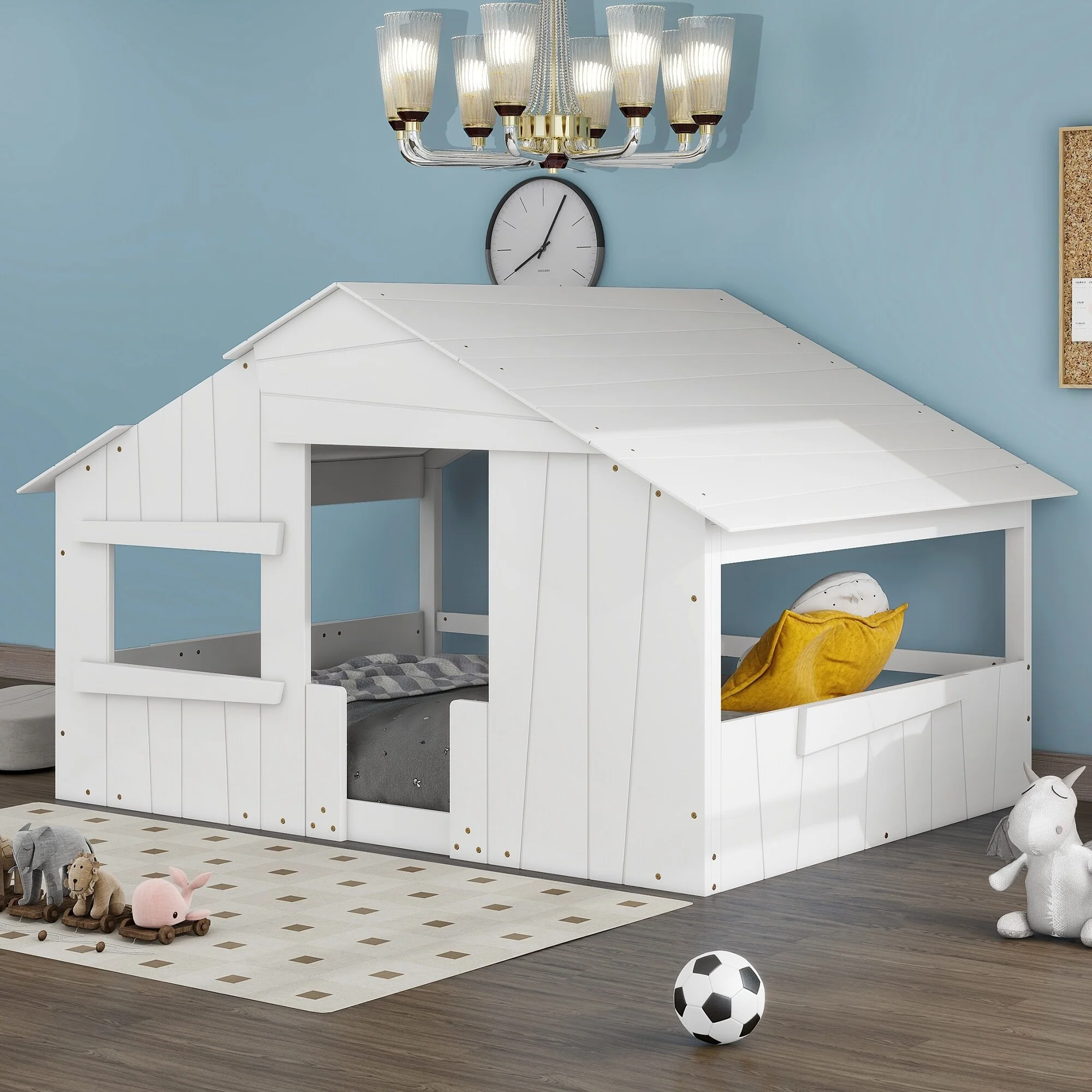 Full Size Solid Wood House Bed with Roof & Window